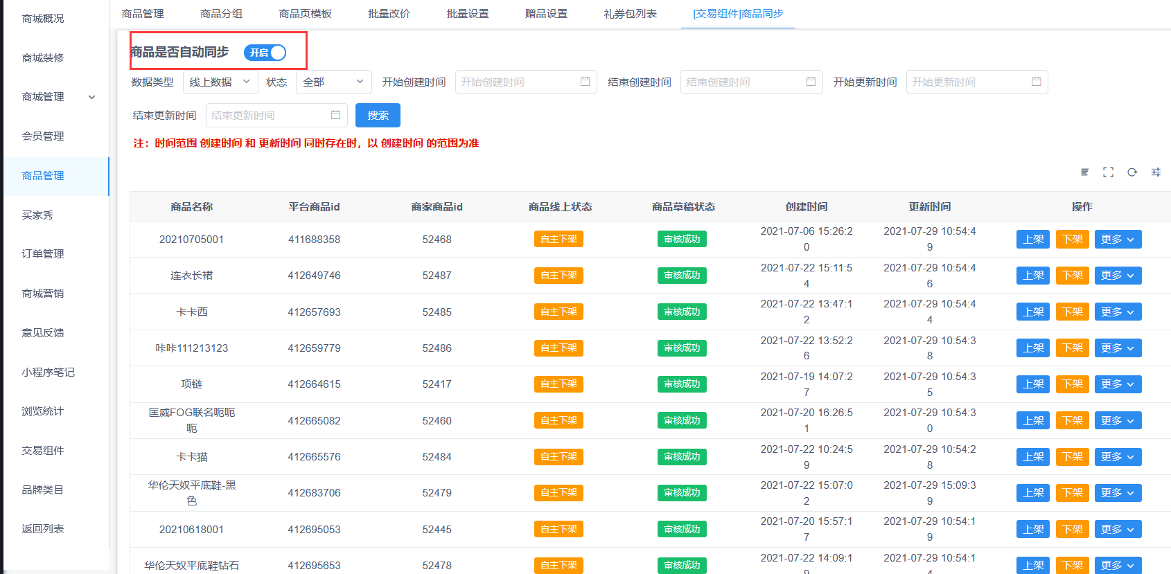 2.1开启商品是否自动同步后,批量配置类目品牌或修改商品信息会自动同步到该模块审核成功后才显示到视频号。