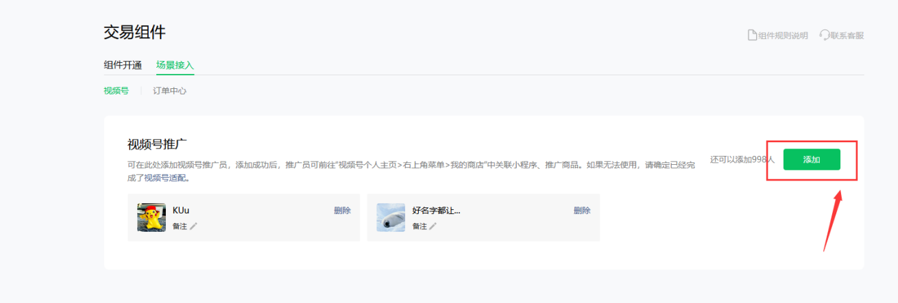 设置推广人员:审核通过后,在交易组件场景接入视频号设置推广人员