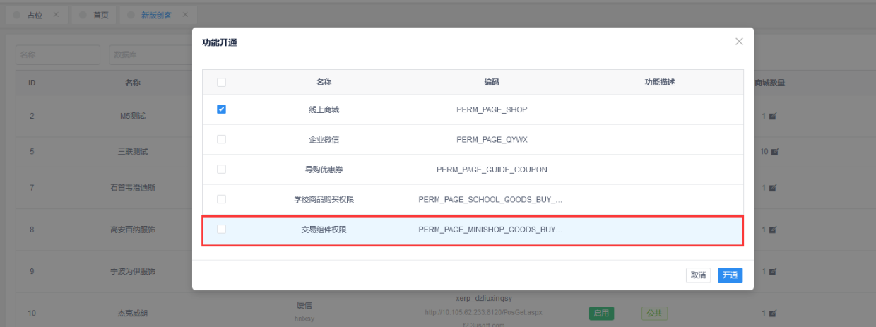 路径:运维平台>新版创客>功能开通,勾起交易组件点击【开通】