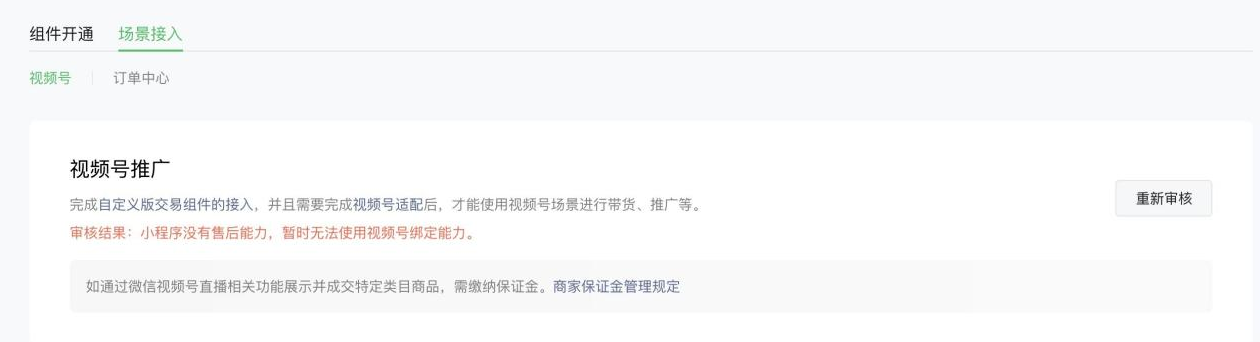以上交易组件设置都开通成功后,登录小程序公众平台找到交易组件>场景接入提交审核,审核通过后才可以添加视频推广人员