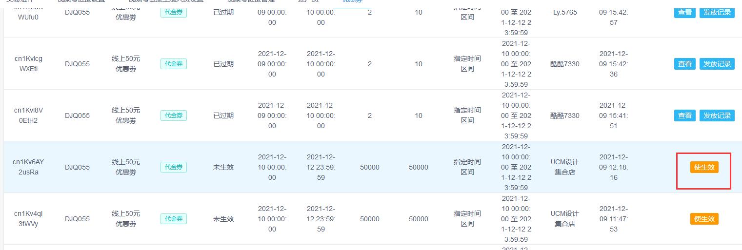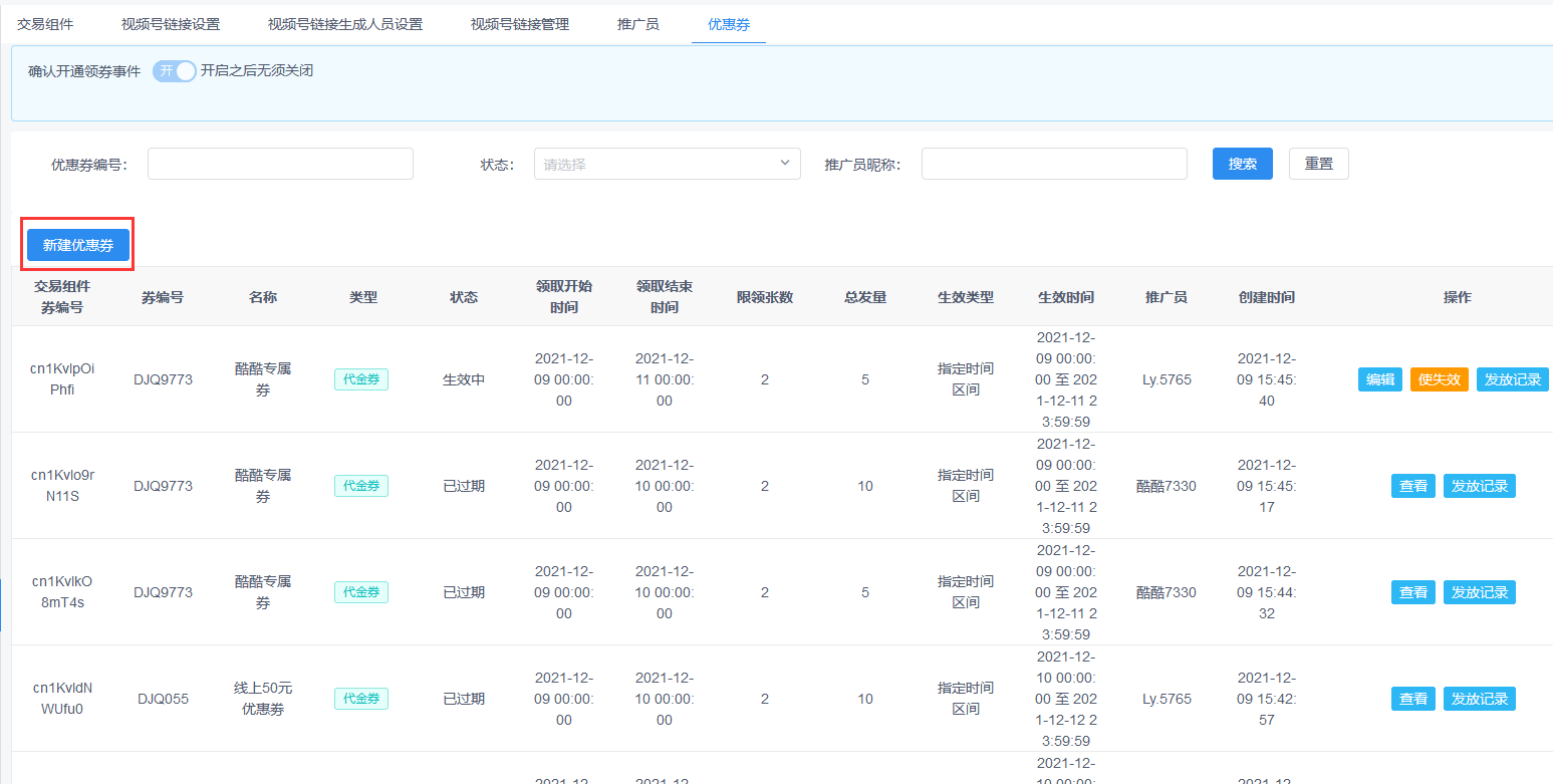 1.2.6新建完后在优惠券列表点击使生效,就可以在视频号直播时进行发放礼券了