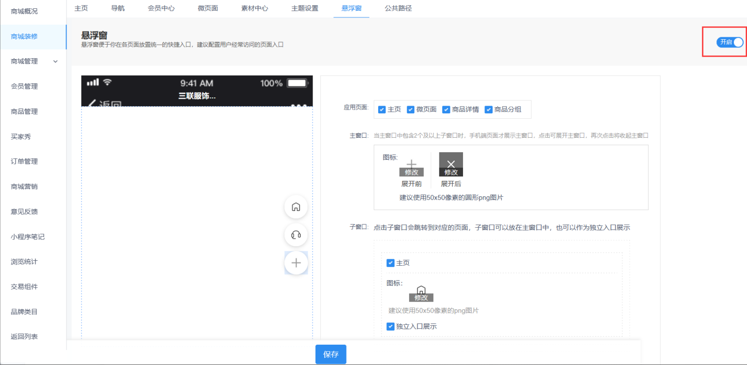 在创客线上商城商城装修找到悬浮窗,右上方有个开启按钮,开启后在下方找到客服勾选客服并设置独立展示