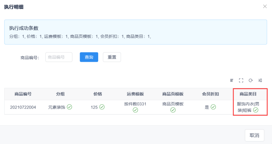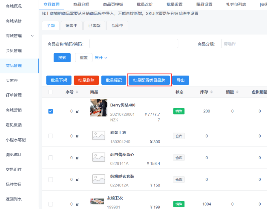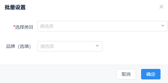 商品管理模块,勾选要设置的商品后点击批量配置类目品牌,进入批量设置页面。