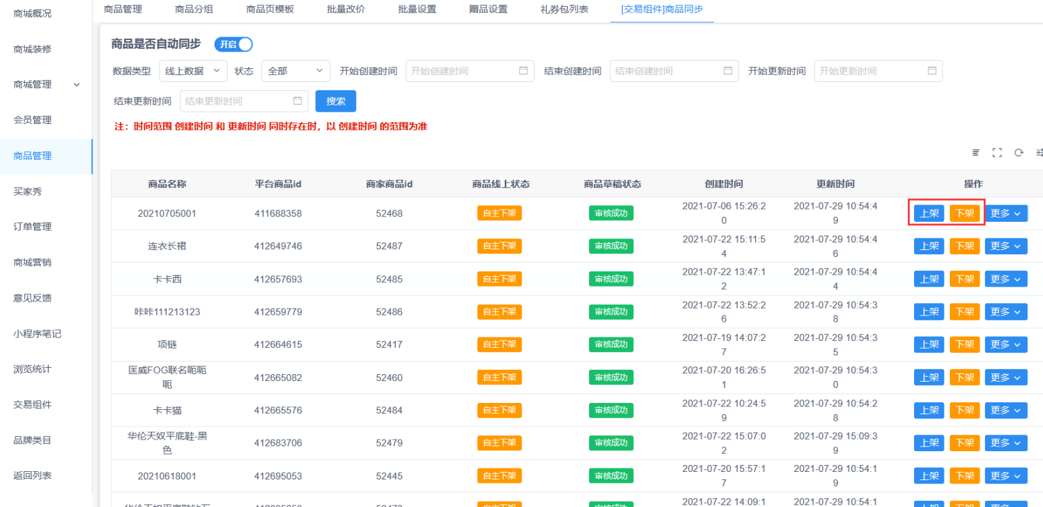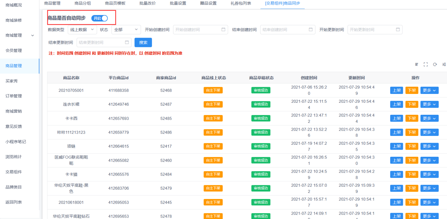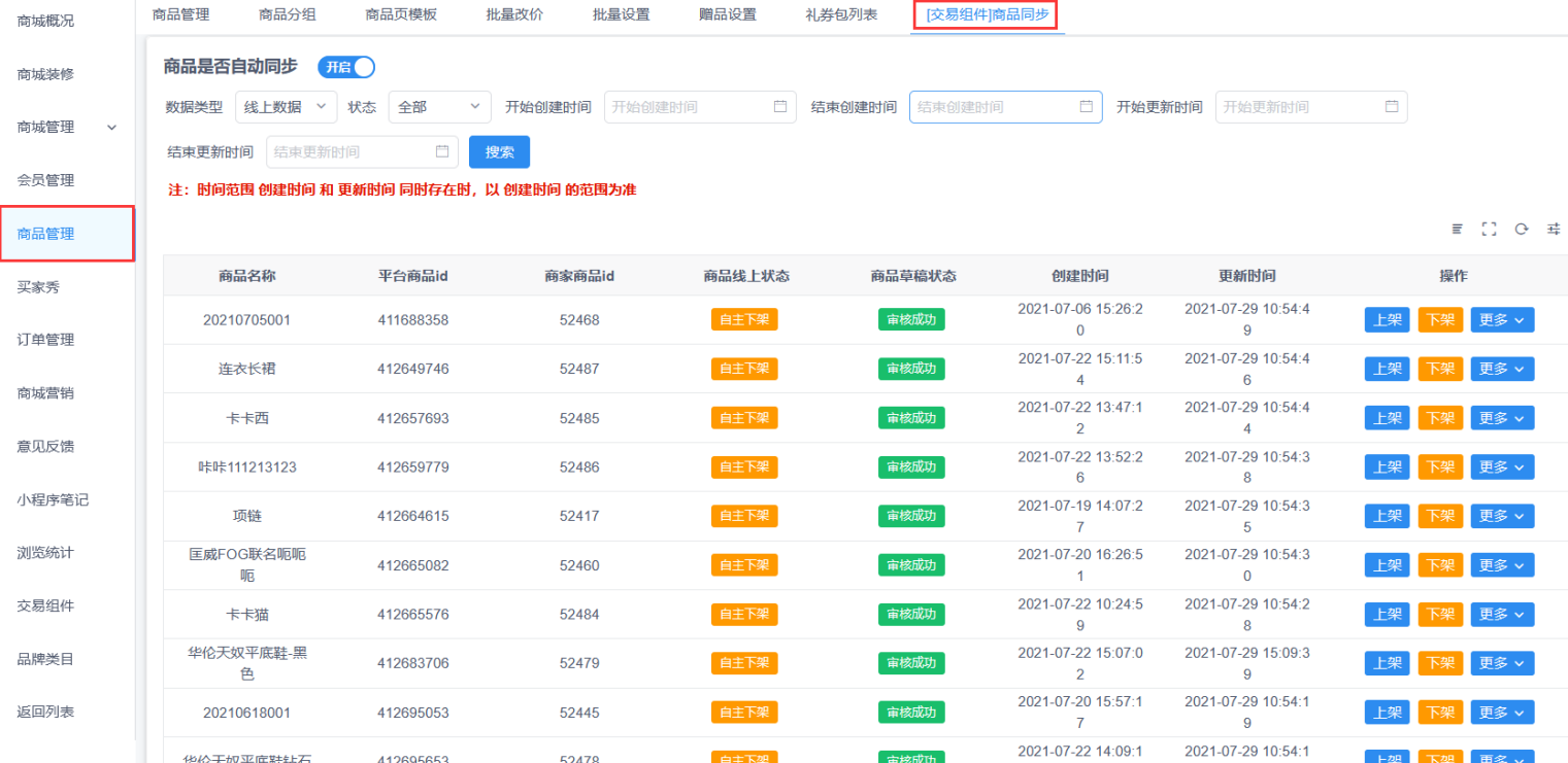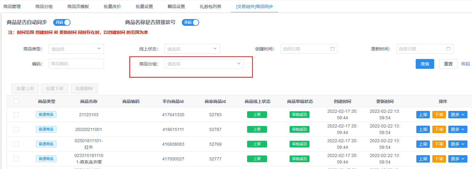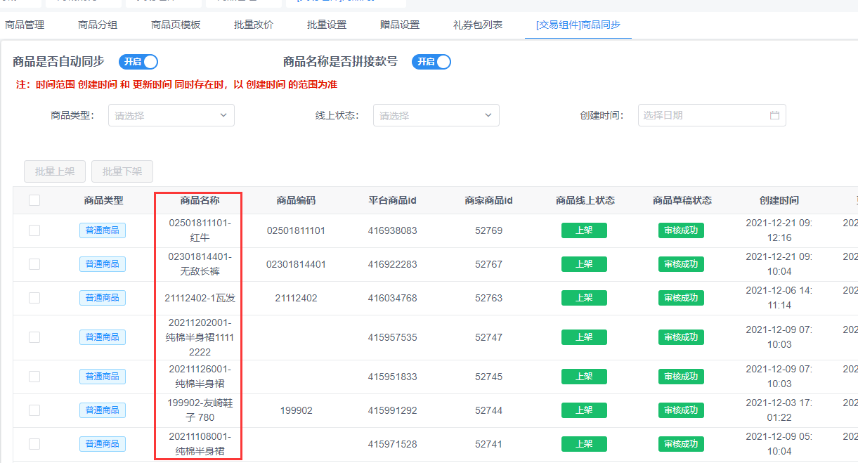 商品管理(交易组件)商品同步,开启商品名称拼接按钮后会把商品款号同步到商品名称前面,方便视频号直播时搜索商品