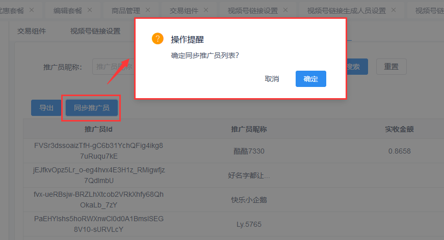 2.3点击“同步推广员”,会同步微信公众平台那边的视频号推广员信息