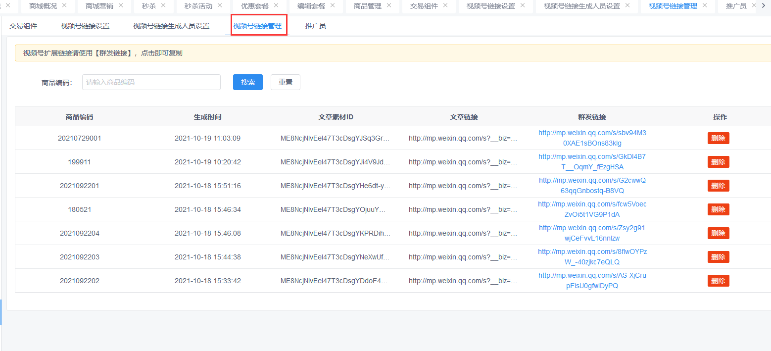 视频号链接生成人员在小程序点击分享生成视频号链接后,公众号就会自动推送该商品链接,然后创客视频号链接管理生成视频号链接管理记录