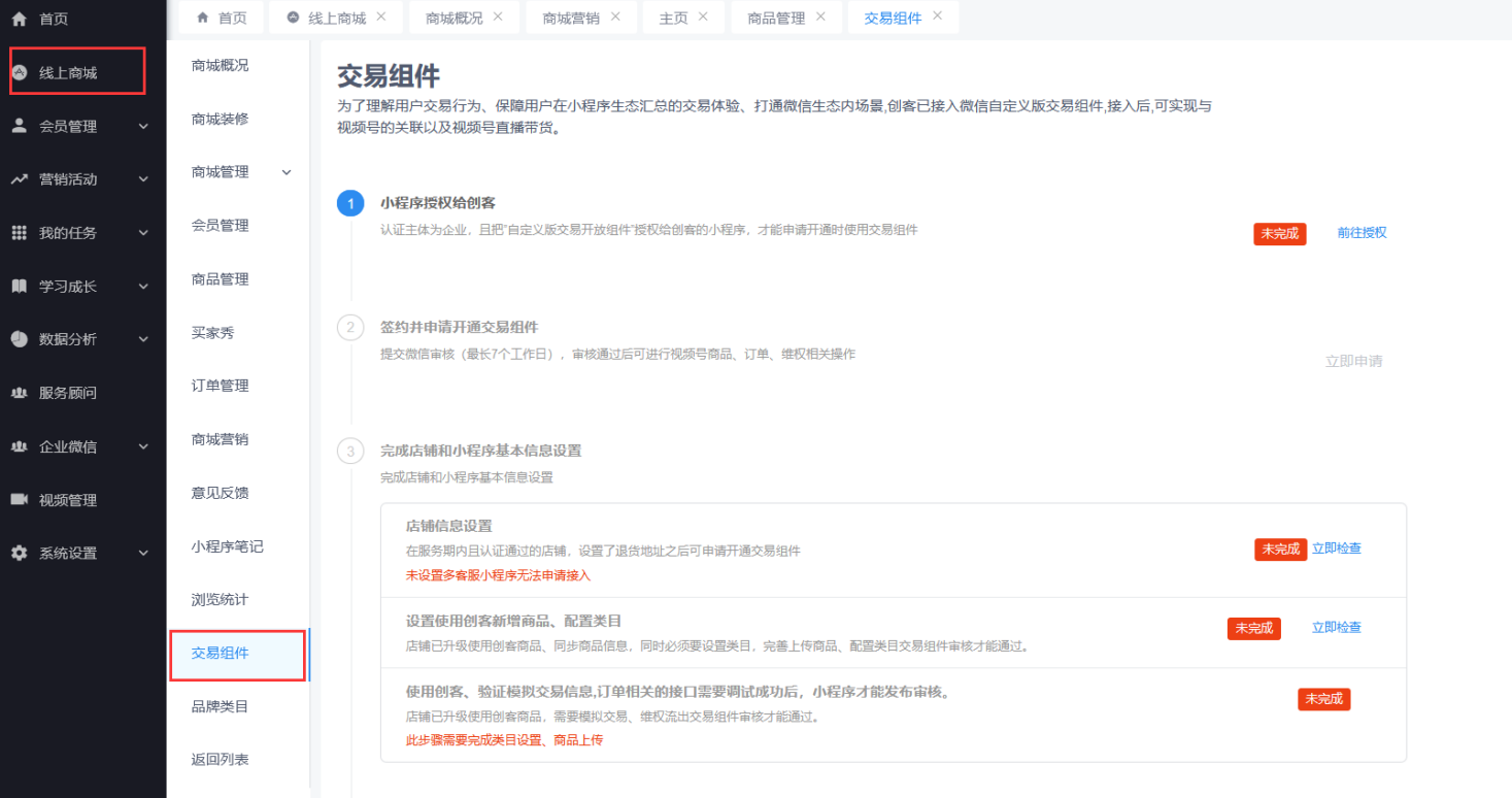 在交易组件栏完成店铺和小程序基本信息设置