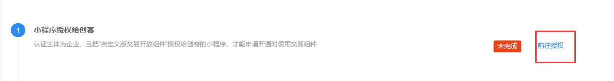 在交易组件栏,点击【立即授权】认证主体为企业,且把”自定义版交易开放组件”授权给创客的小程序,才能申请开通时使用交易组件(****如果已经接入标准组件,暂不支持切换为自定义组件****)