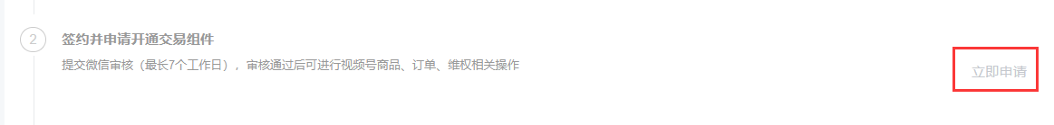 在交易组件栏,点击【立即申请】签约并申请开通交易组件,**需提交微信审核(最长7个工作日)**,审核通过后才可进行视频号商品、订单、维权相关操作。