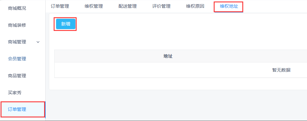 在创客线上商城>订单管理>维权地址,新增维权地址。