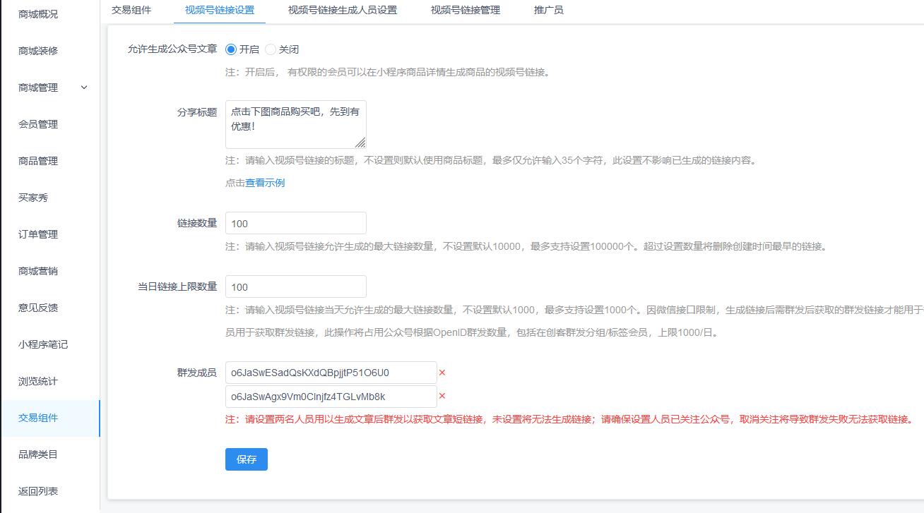 1.1开启允许生成公众号文章,有权限的会员可以在小程序商品详情生成商品的视频号链接。