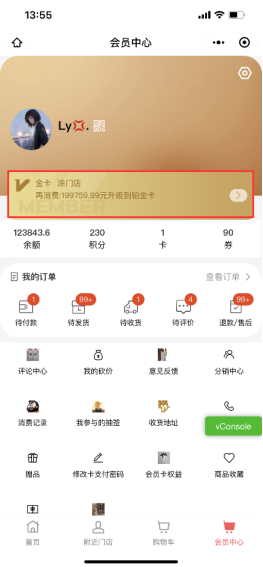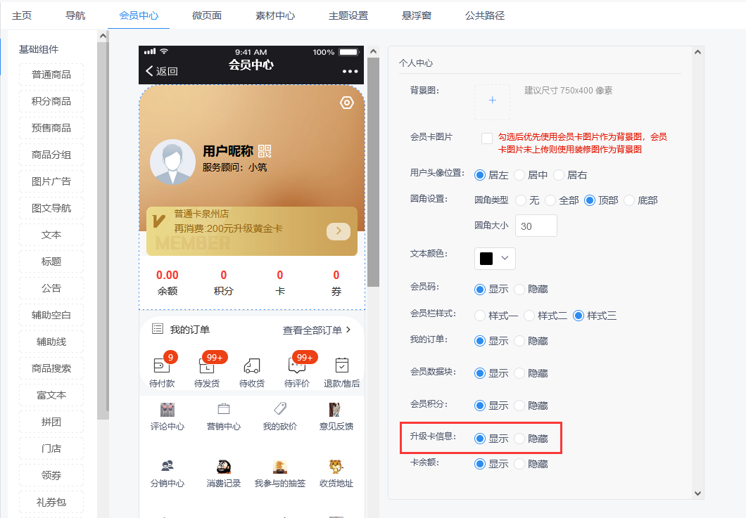 商城装修会员中心增加升级卡信息是否显示或隐藏