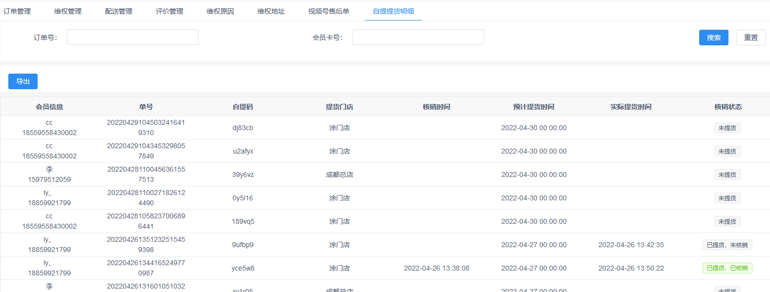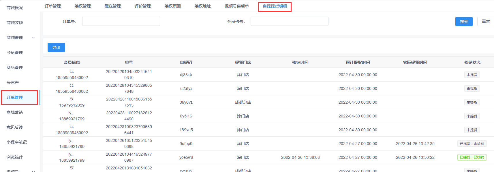 2.开启后在小程序下单到店自提订单在“自提提货明细”可以查看提货信息和核销状态