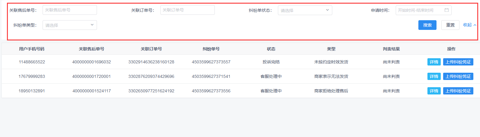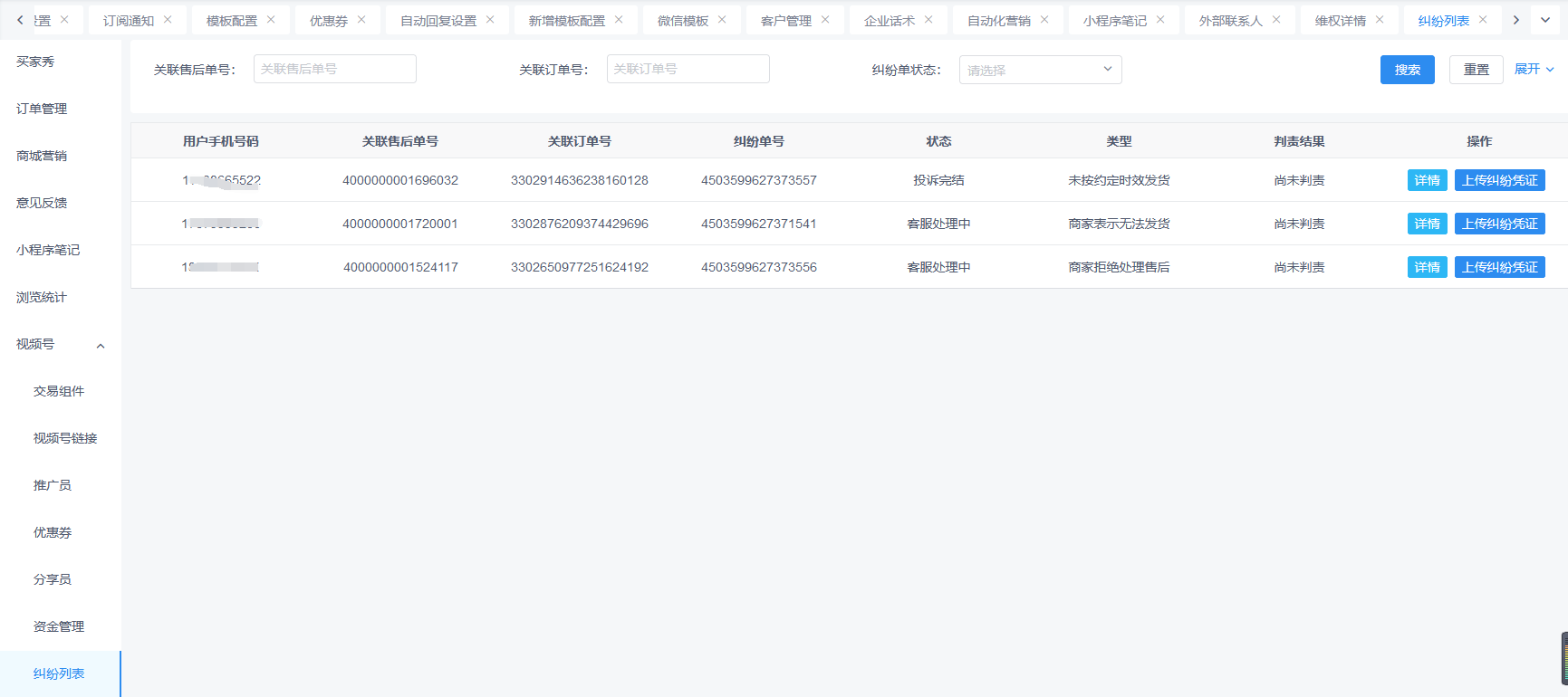 1.视频号纠纷列表上方可根据关联售后单号、关联订单号、纠纷单状态、申请时间、纠纷单类型进行筛选查看列表数据。
