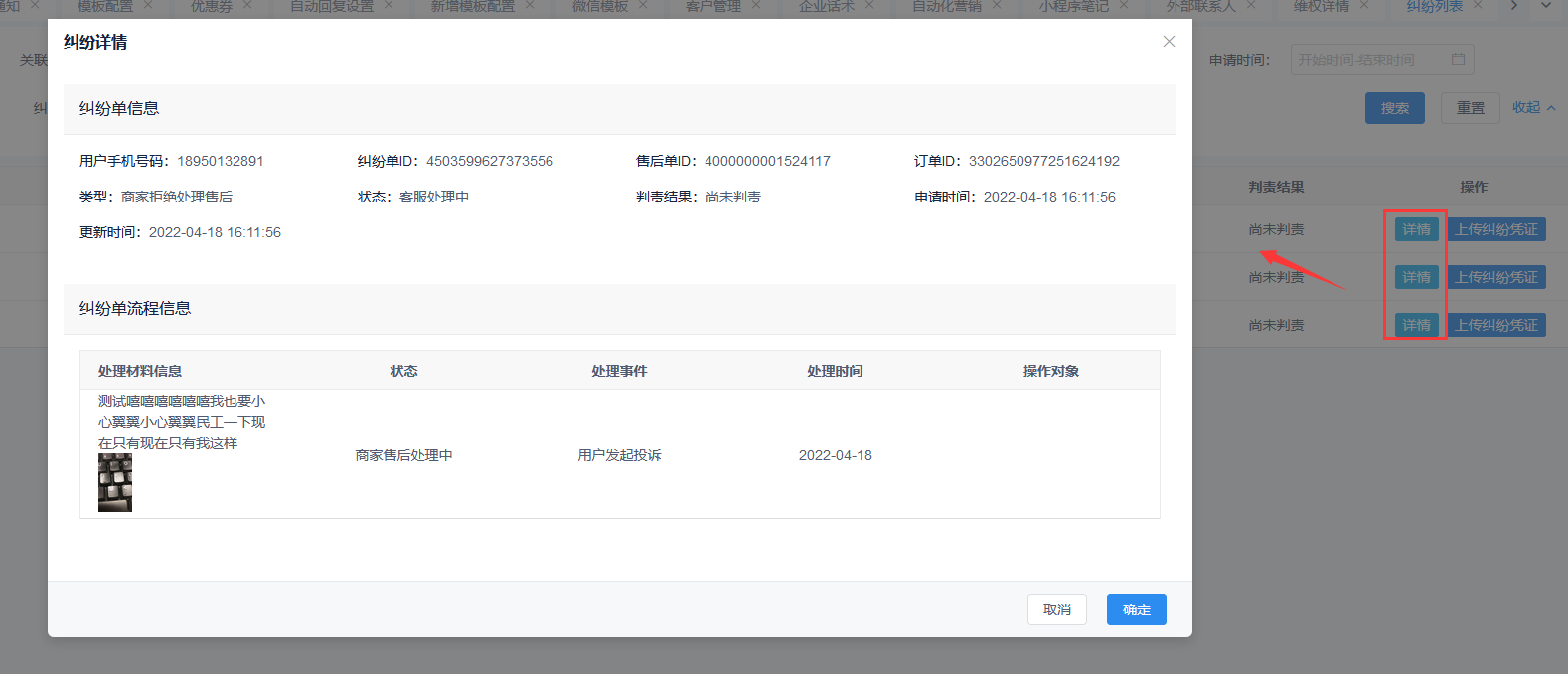 2.纠纷列表操作栏点击详情可查看纠纷单信息和纠纷单流程信息