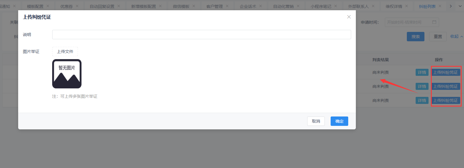 3.纠纷列表操作栏点击“上传纠纷凭证”可上传图片和说明