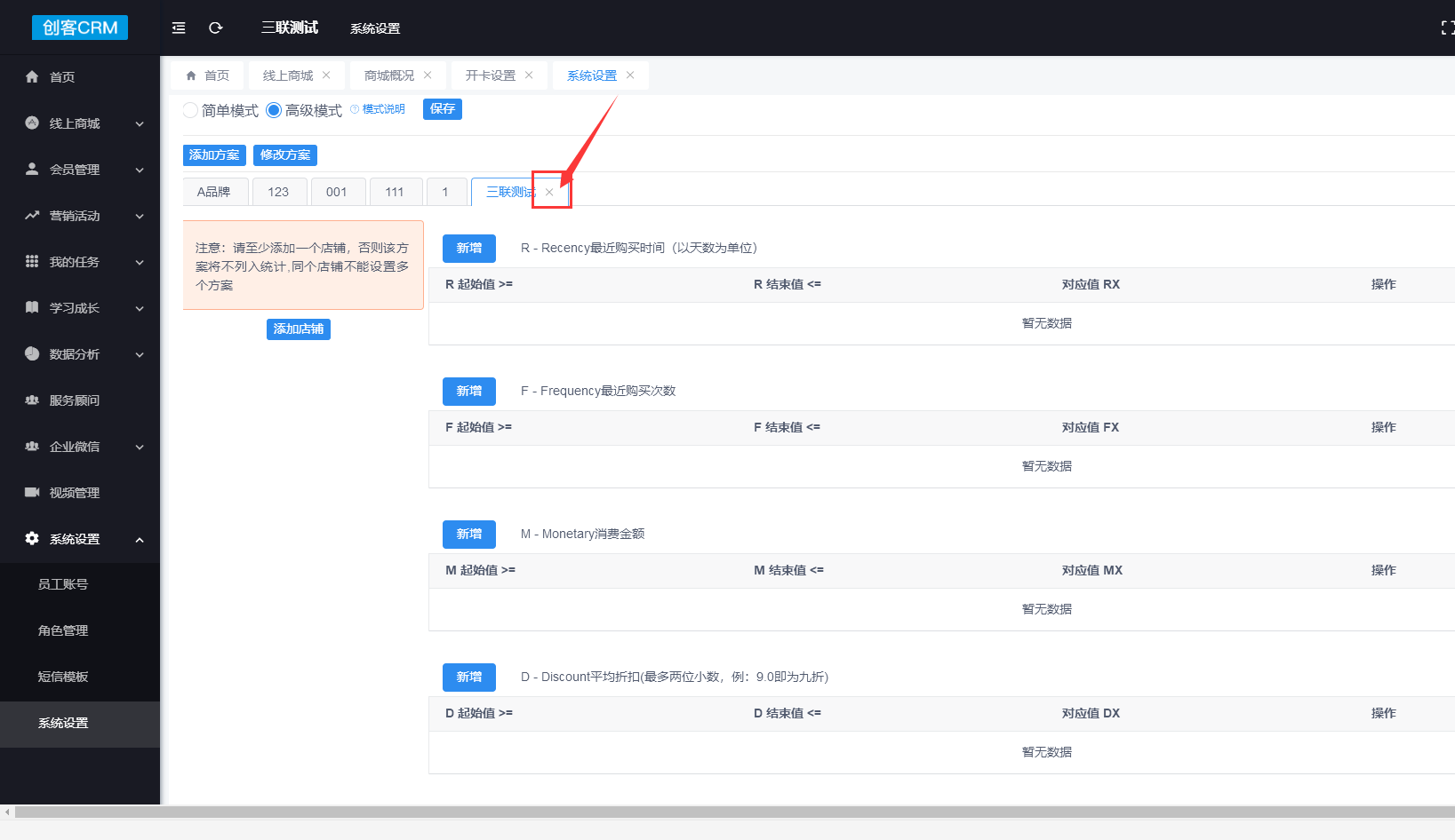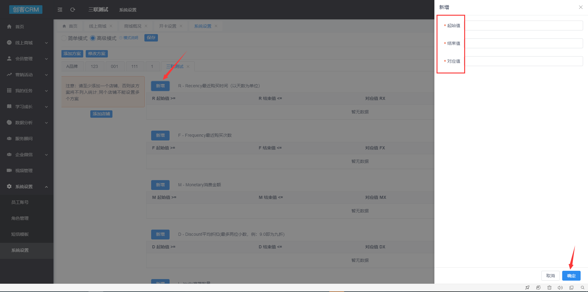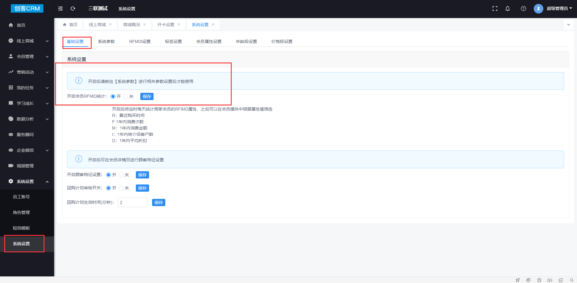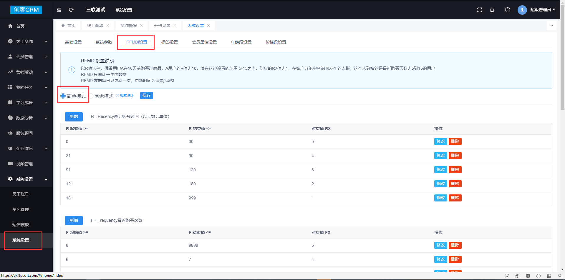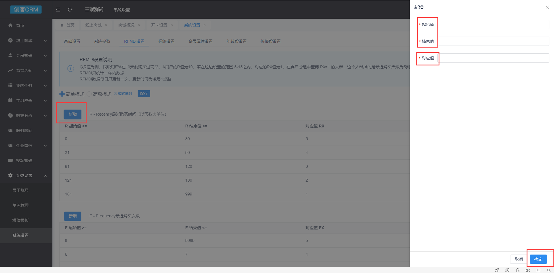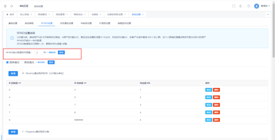 选择【开】按钮后点击保存即可开启会员RFMID统计。开启后应前往设置-》系统设置-》RFMID设置进行相关参数区间设置。会员页面将会根据区间进行相应数据统计