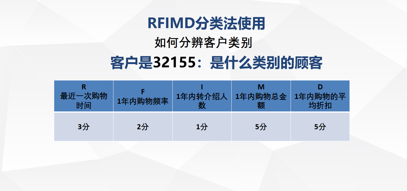 **假设有一位顾客,通过系统分析该顾客的消费行为,自动分析出,该顾客为32155类别的等级顾客