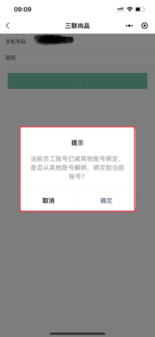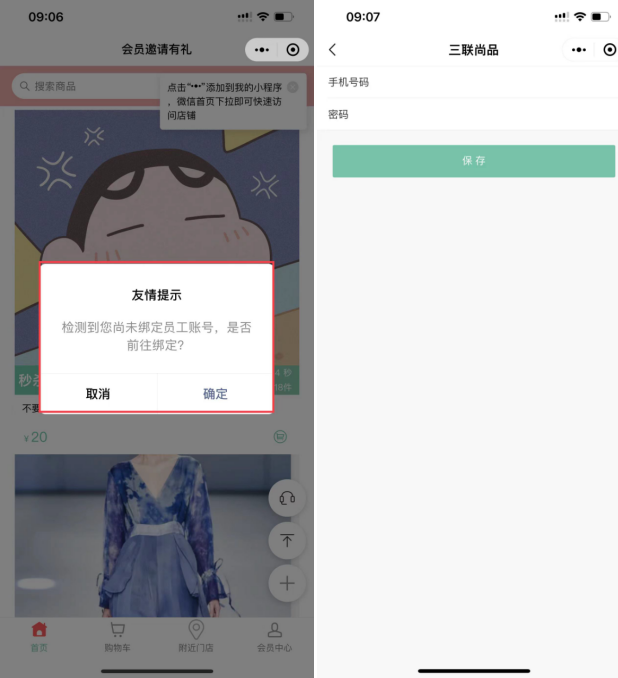 企业微信小程序商城进入时如果没绑定导购则会提示“检查到您尚未绑定员工账号,是否前往绑定”,绑定则需要输入手机号码和密码。