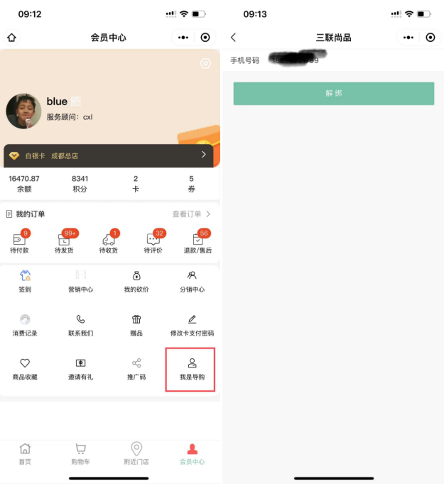 企业微信小程序商城会员中心增加“我是导购”,进入可以进行绑定或者解绑导购身份