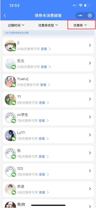 企业微信工作区优惠券领券未消费顾客增加优惠券过滤