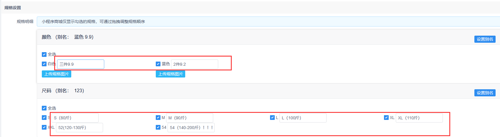### **一、小程序商品规格颜色优先展示别名**