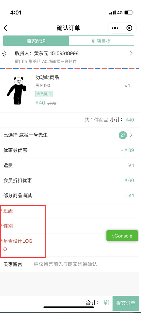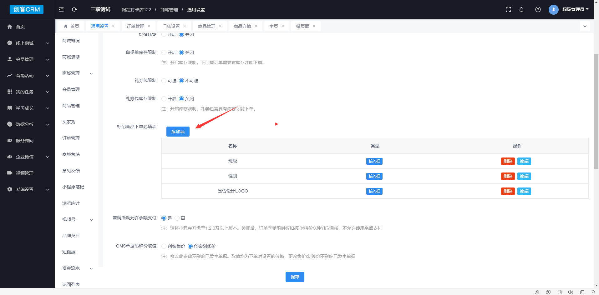 **10,标记商品下单必填项**:(该功能为客户特殊开发定制功能,应用场景:比如学校要定制校服,可以让各班班主任直接下单定制,标注班级等其他特殊信息)