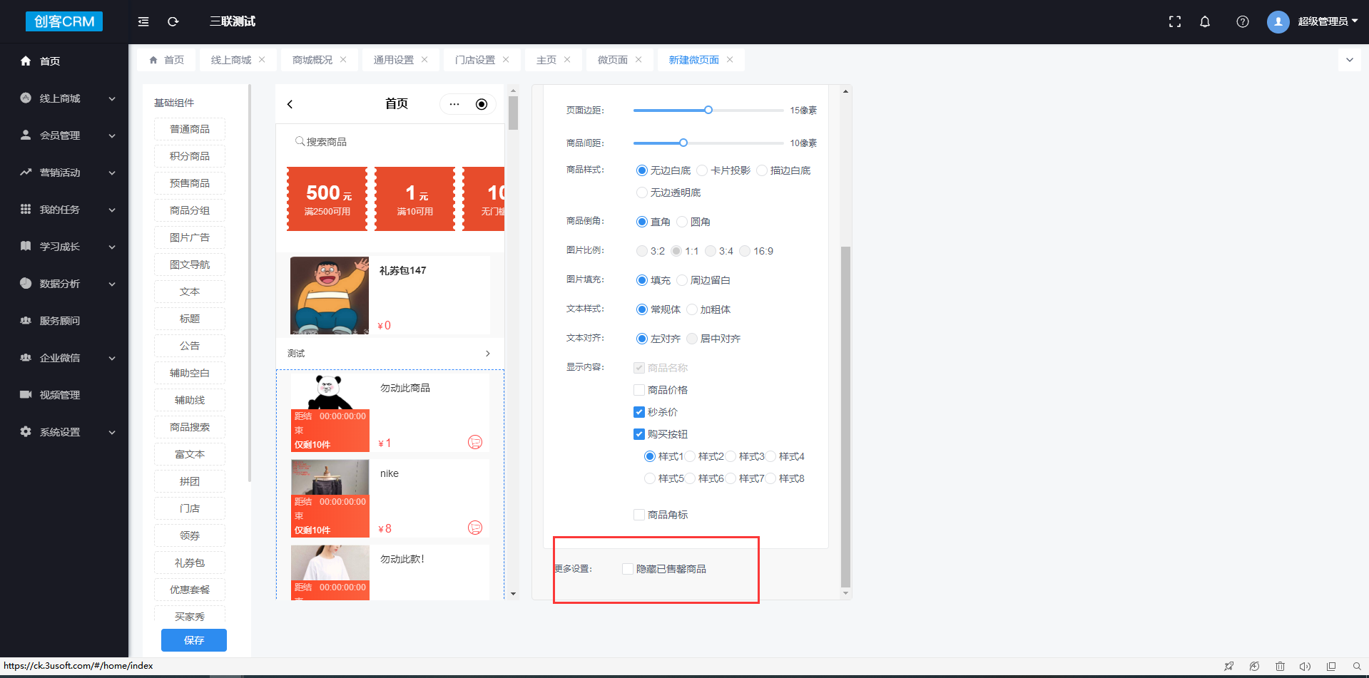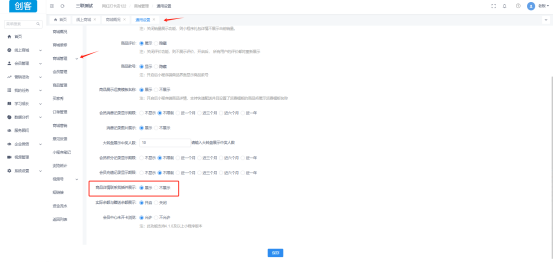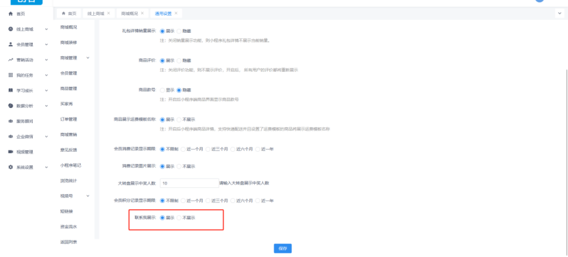 **7,隐藏售罄商品**:已经售罄完的商品就不会在商品列表里面显示(注:该参数为总开关,当你开启后小程序端将隐藏全部已售罄的商品,不受其他设置(如微页面装修中的【隐藏售罄商品】)影响)