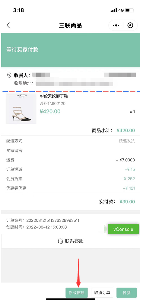 b,会员订单中心里面的修改信息(只有待付款的单子才能修改)