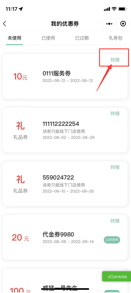 **1,优惠券转赠**:开启之后,会员中心的优惠券会显示转赠按钮(注意:礼物券暂不支持)