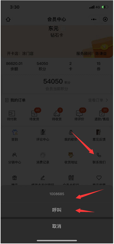**2,联系方式**:设置联系号码之后,会员可通过会员中心中的【联系我们】拨打设置里面的电话