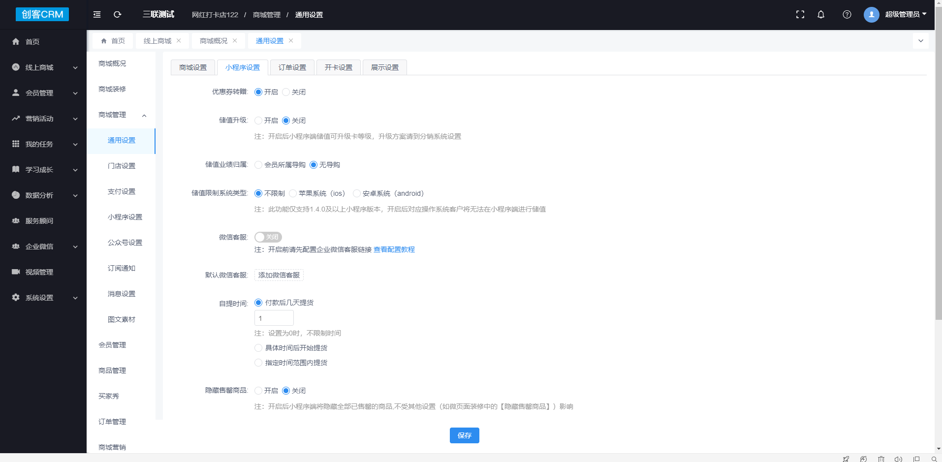 **2,储值升级**:开启后小程序端储值可升级卡等级,升级方案请到分销系统设置