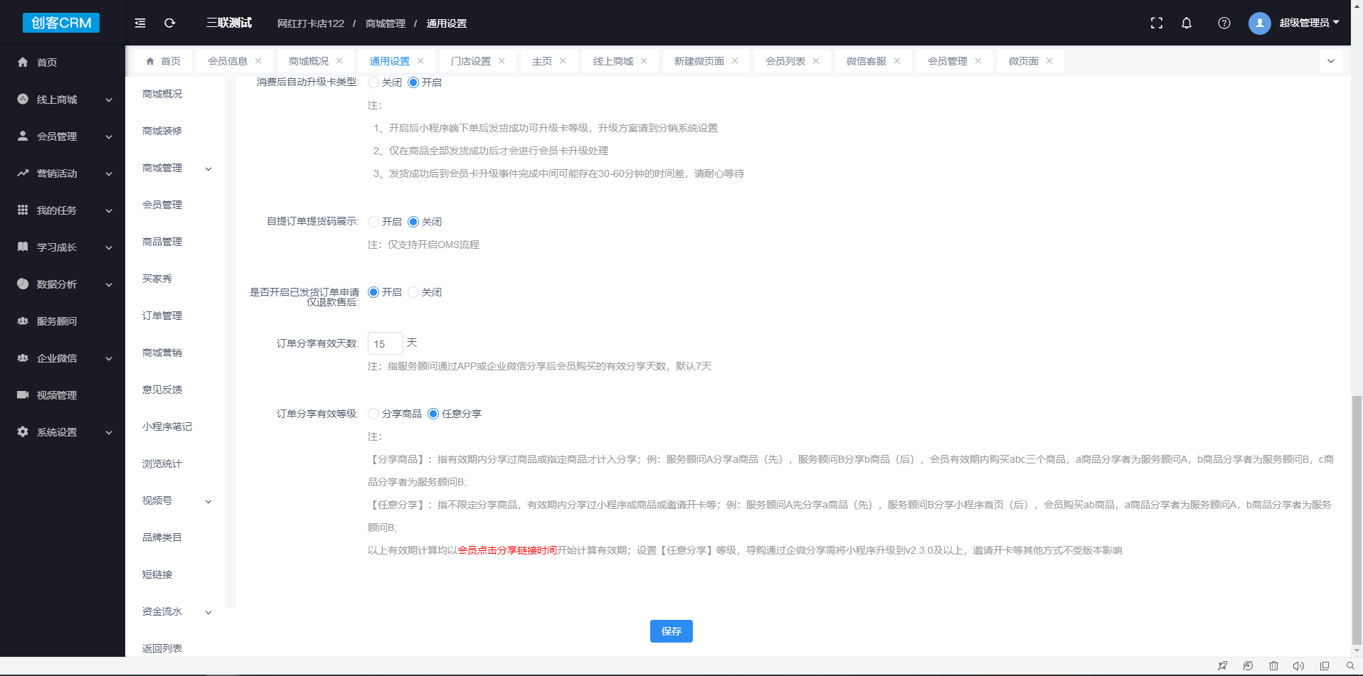 【分享商品】:指有效期内分享过商品或指定商品才计入分享;例:服务顾问A分享a商品(先),服务顾问B分享b商品(后),会员有效期内购买abc三个商品,a商品分享者为服务顾问A,b商品分享者为服务顾问B,c商品分享者为服务顾问B;【任意分享】:指不限定分享商品,有效期内分享过小程序或商品或邀请开卡等;例:服务顾问A先分享a商品(先),服务顾问B分享小程序首页(后),会员购买ab商品,a商品分享者为服务顾问A,b商品分享者为服务顾问B;以上有效期计算均以会员点击分享链接时间开始计算有效期;设置【任意分享】等级,导购通过企微分享需将小程序升级到v2.3.0及以上,邀请开卡等其他方式不受版本影响
