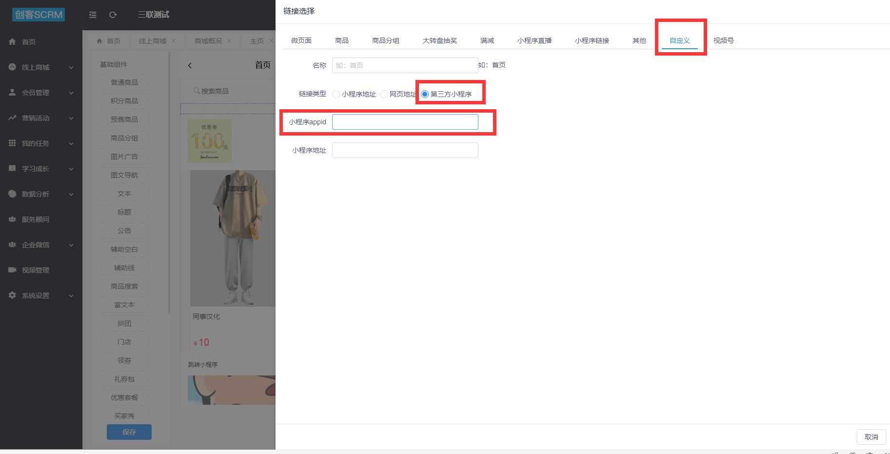 跳转其他小程序需要在小程序装修的链接选择弹窗,自定义tab新增链接类型跳转第三方小程序 ;