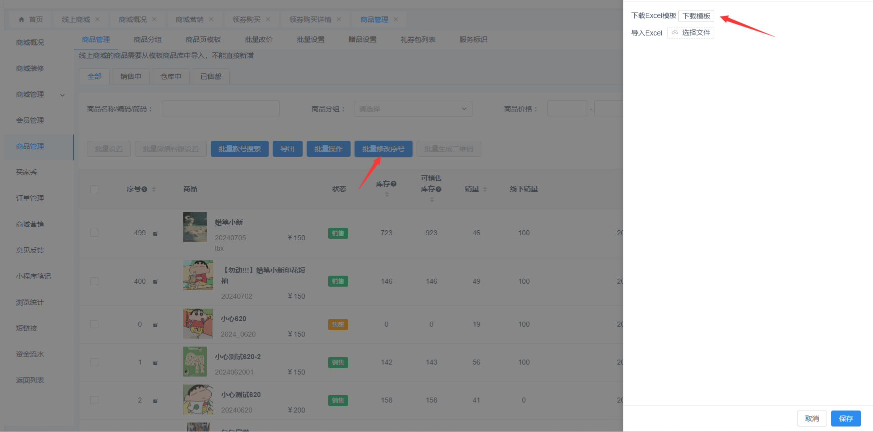 商品管理新增一个excel表格导入的方式实现批量修改序号