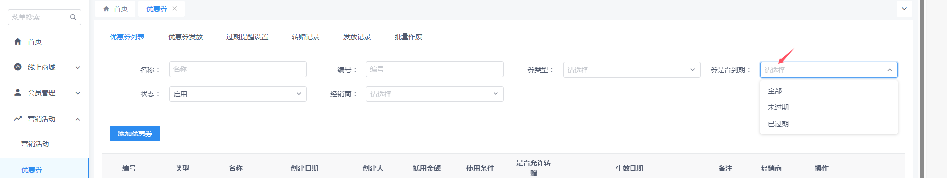 优惠券的新增在: 营销--》优惠券 下,点击【添加优惠券】按钮 新增