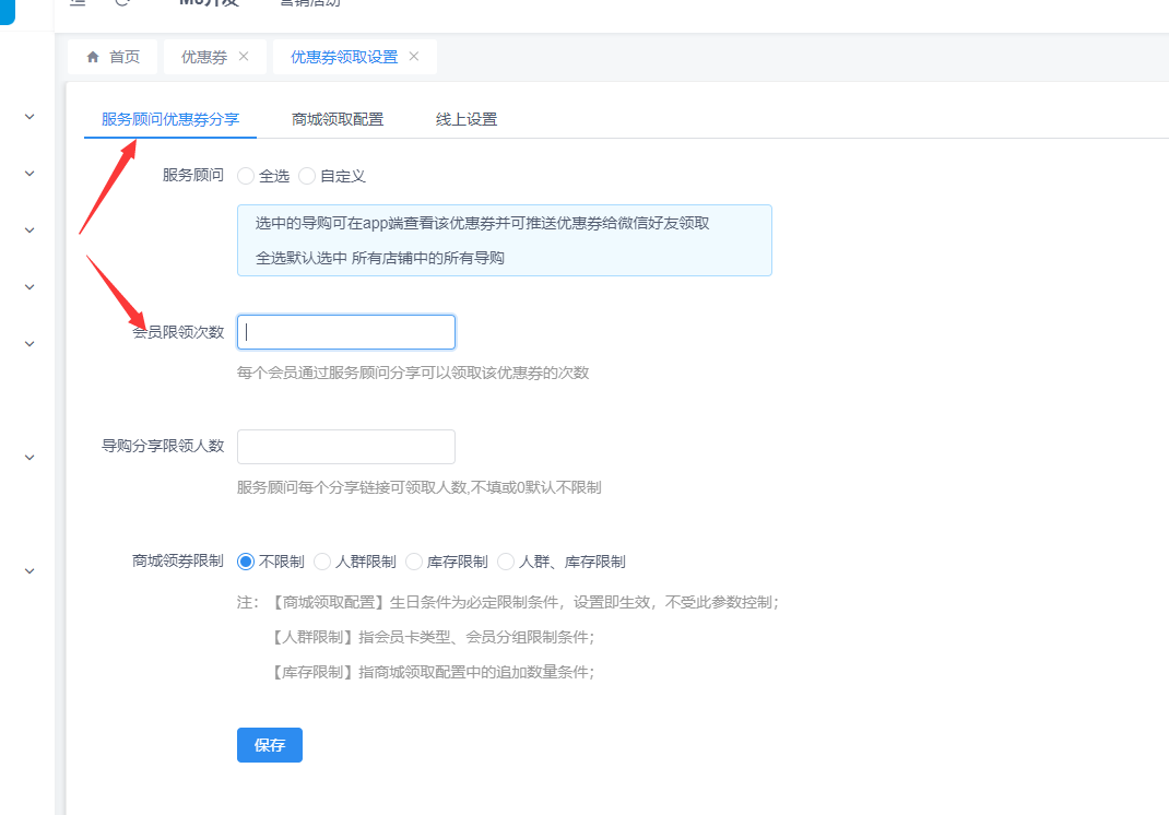 **1.4商城领券限制** (勾选后导购推送礼券成功,会员领券时将受【商城领取配置】中的会员卡类型、会员分组、企微客户群的领取条件限制)