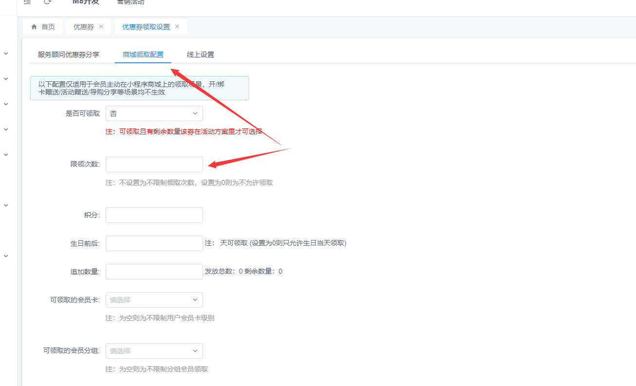 以下配置仅适用于会员主动在小程序商城上的领取场景,开/绑卡赠送/活动赠送/导购分享等场景均不生效