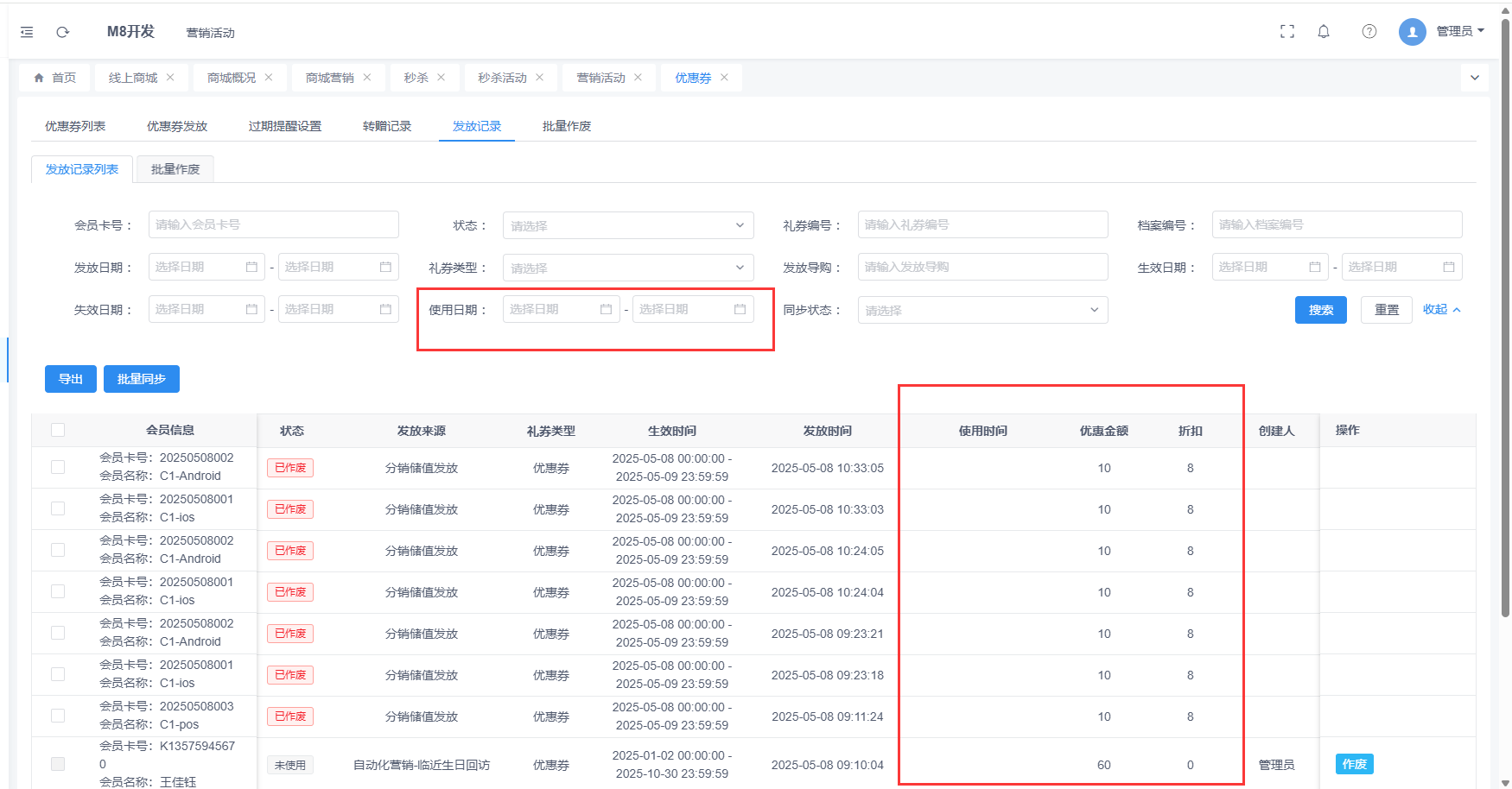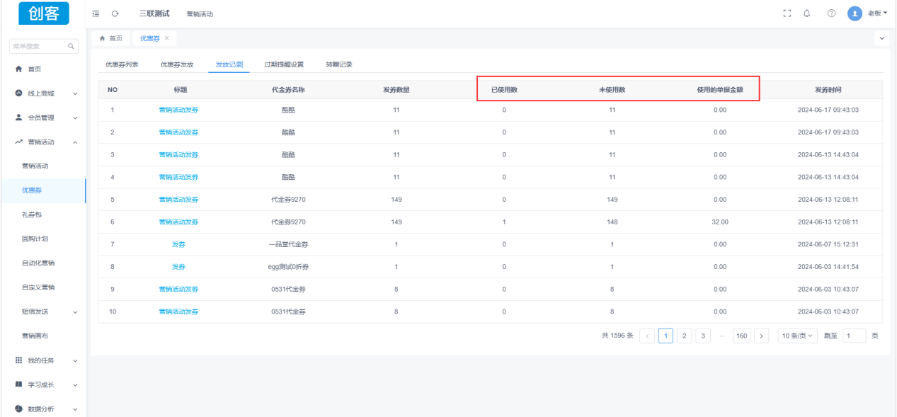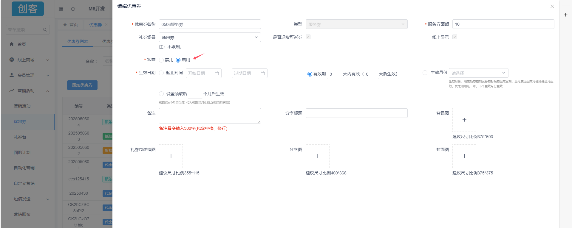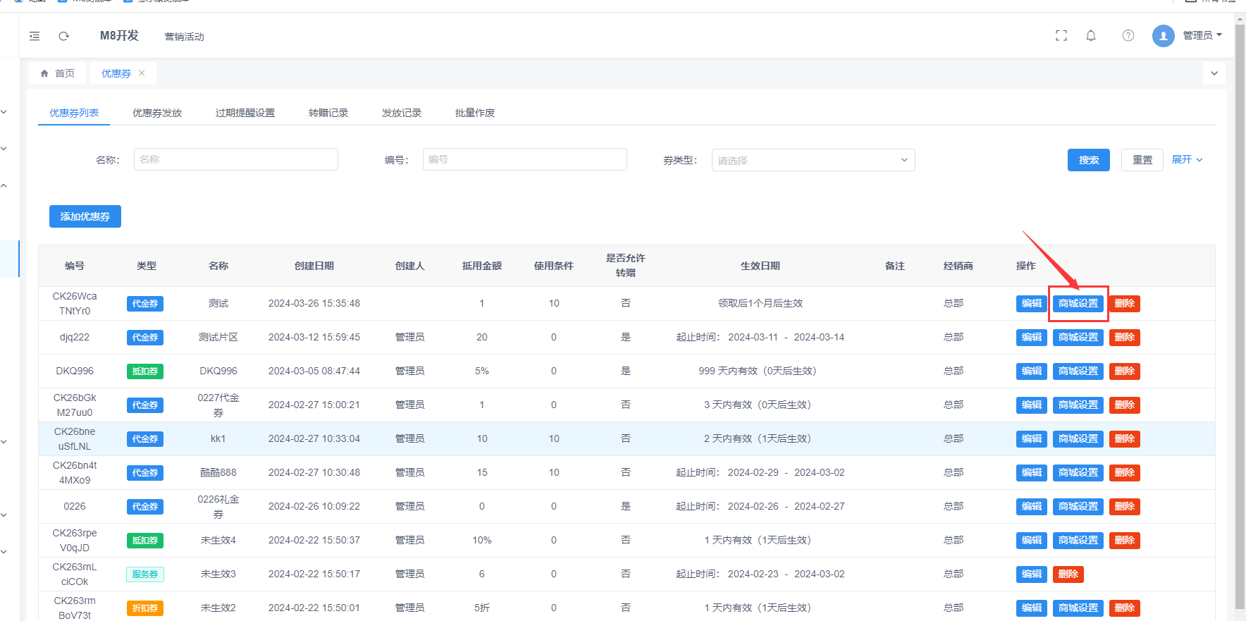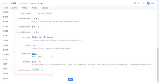 在要修改的优惠券记录的操作栏,点击【编辑】按钮进入编辑弹出框设置,设置完之后点击保存,保存当前的修改。
