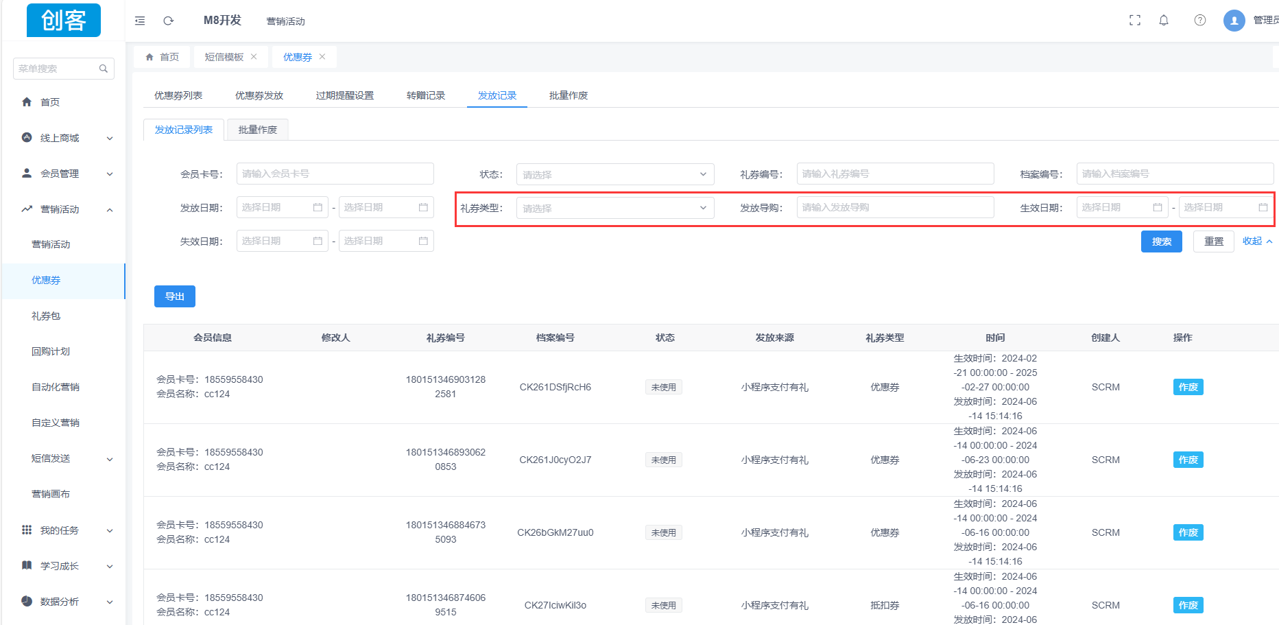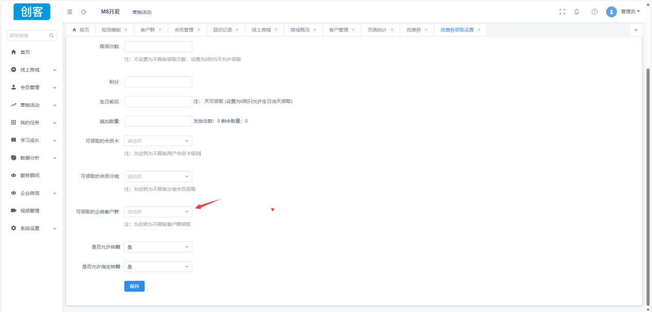 **2.8可领取的企微客户群**:限制可以领取该礼券的企业微信客户群(客户群可以在创客>企业微信>客户群进行同步)
