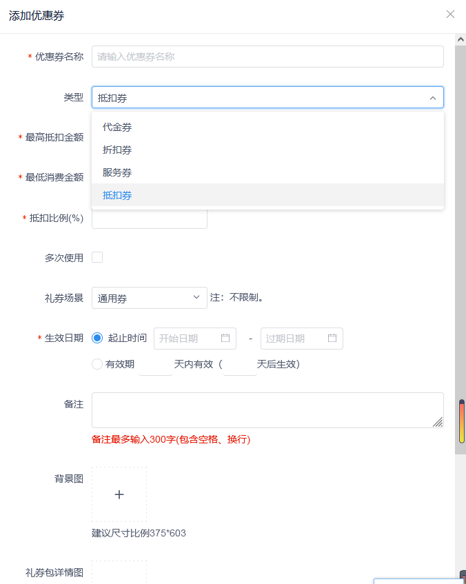 1. **代金券** 满足指定条件可以抵扣设定的金额;