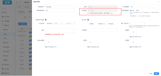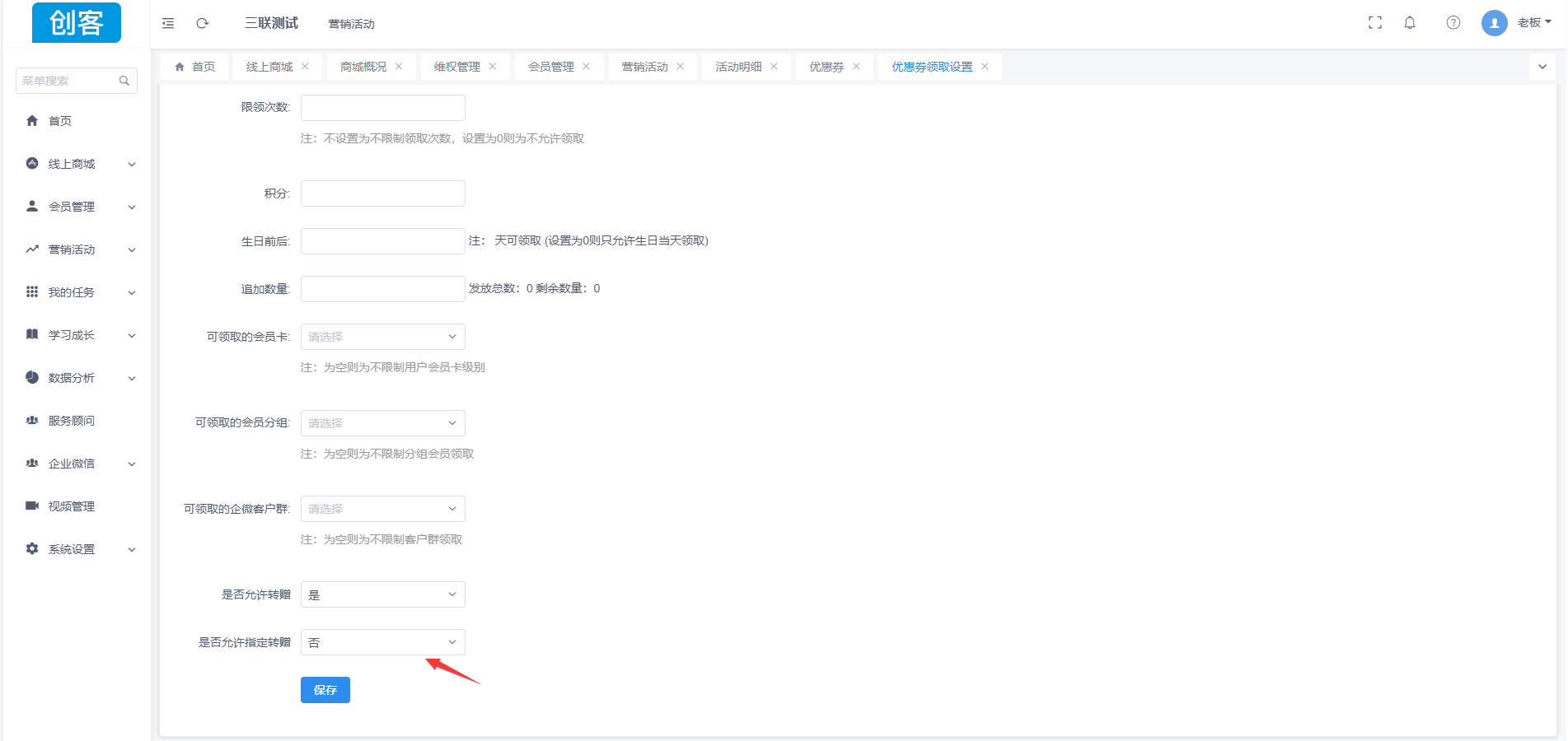 **2.9是否限制转赠**:限制该礼券是否支持转赠给其他会员(礼券详情页可以进行转赠,转赠记录列表可以在创客里面优惠券>转赠记录里面进行查看)