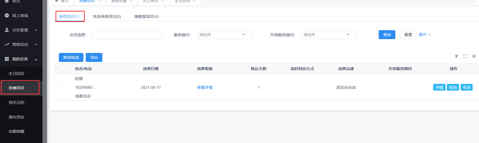 在每个回访Tab页面,都有【群发短信】、【短信】和【电话】按钮,可以选择不同的方式进行回访。