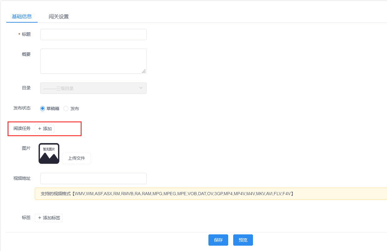 点击【新增】后进入新增文章页面,新增文章分为两块内容:基础信息和闯关设置,基础信息用来设置文章标题、文章内容等基础信息