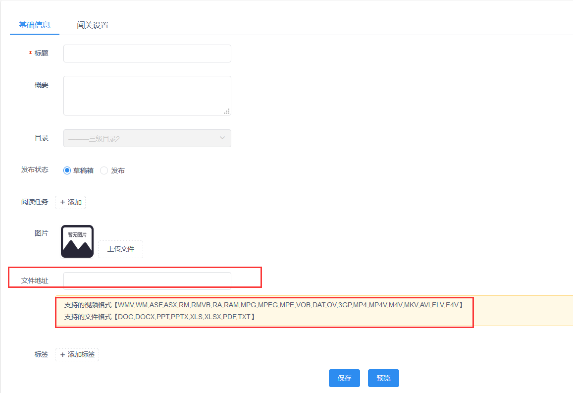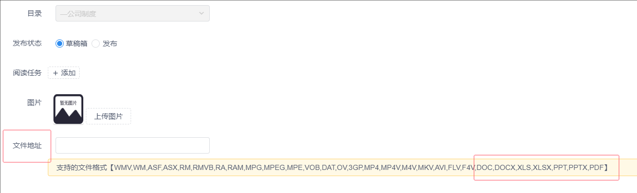 4.学习成长文章管理【视频地址】名称改成【文件地址】,下面说明新增类型,word,excel,ppt,pdf