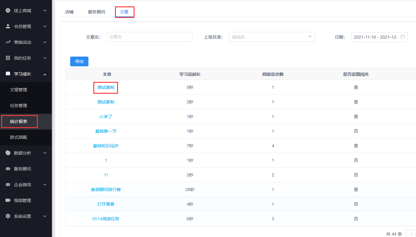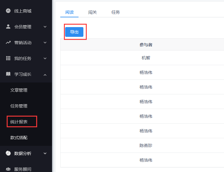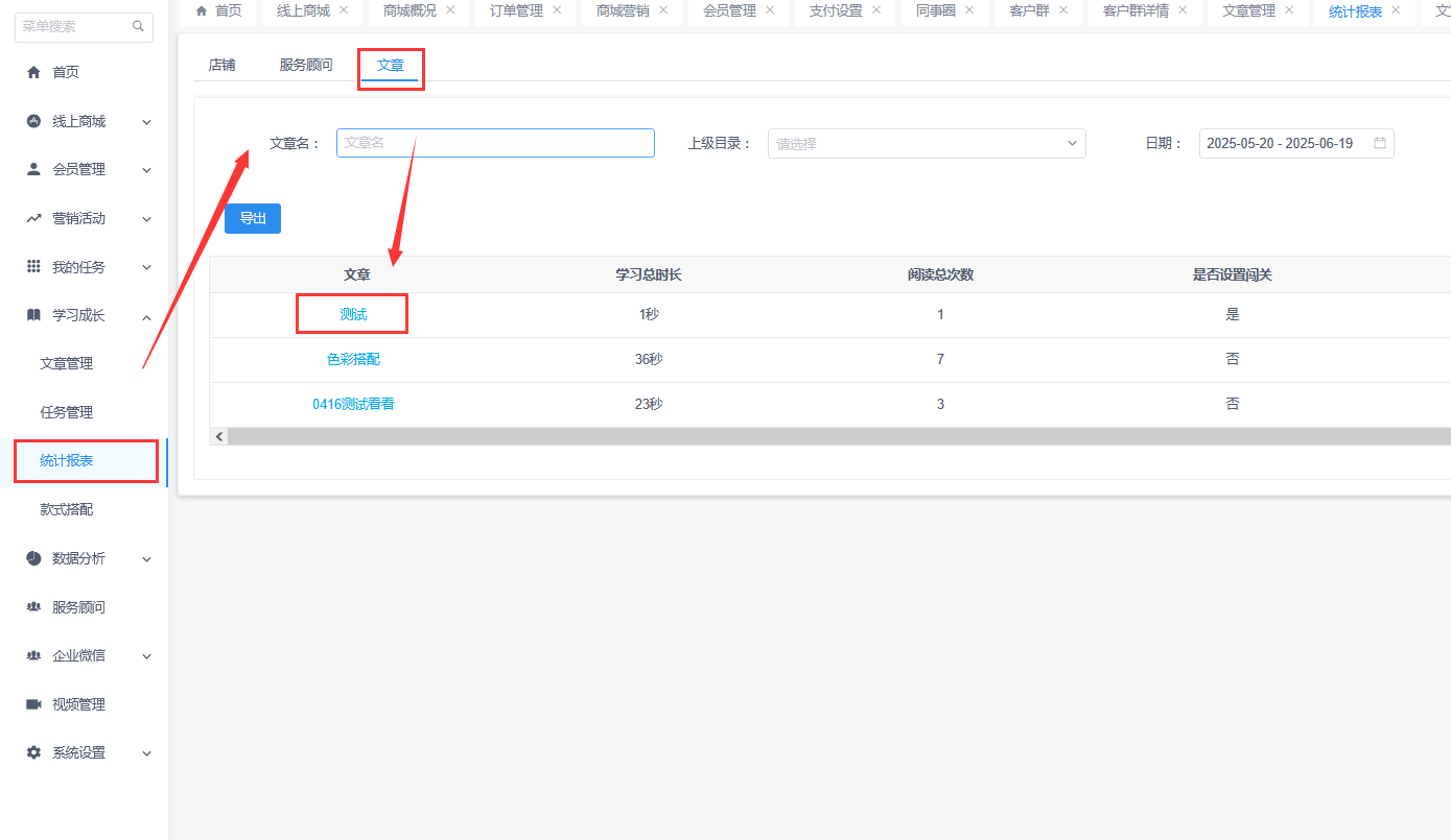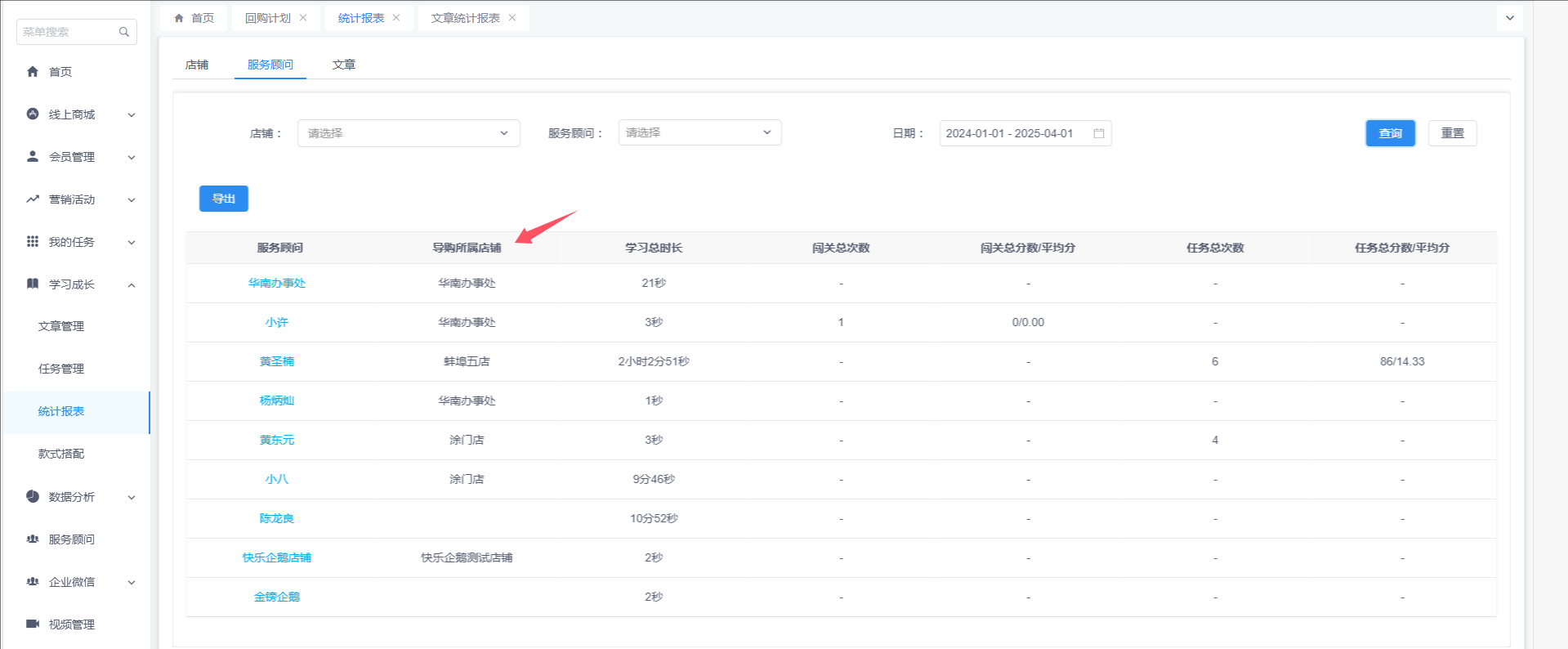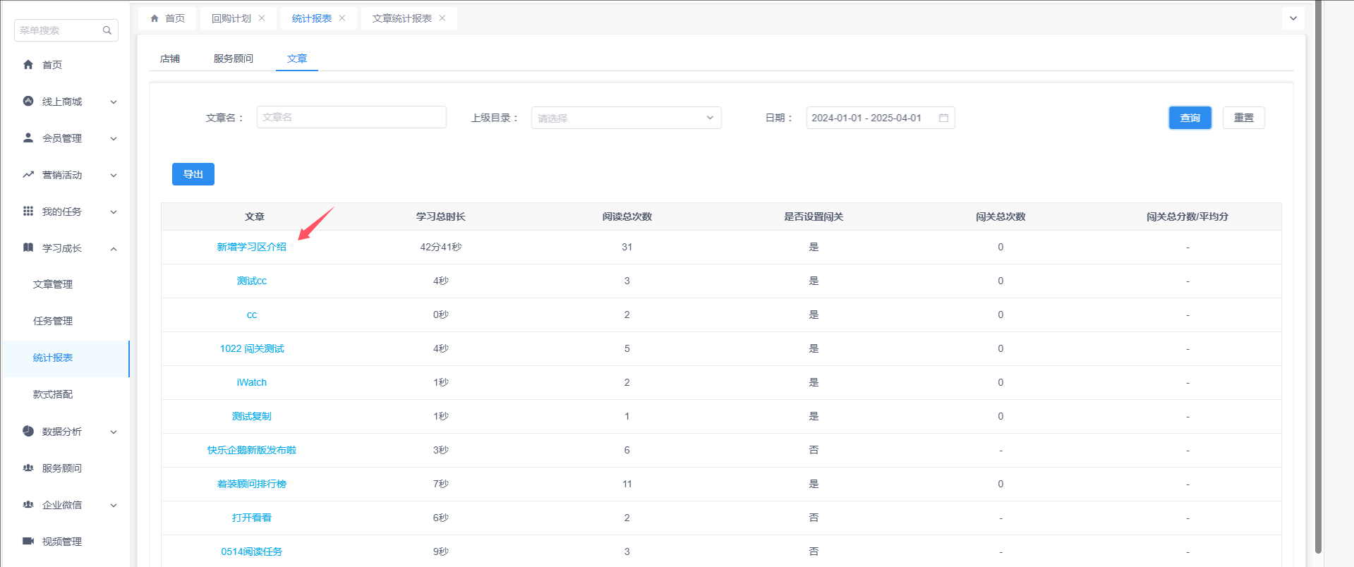 学习区的统计报表功能主要从店铺、导购以及文章三个方面来统计任务完成情况、阅读记录以及闯关记录等数据