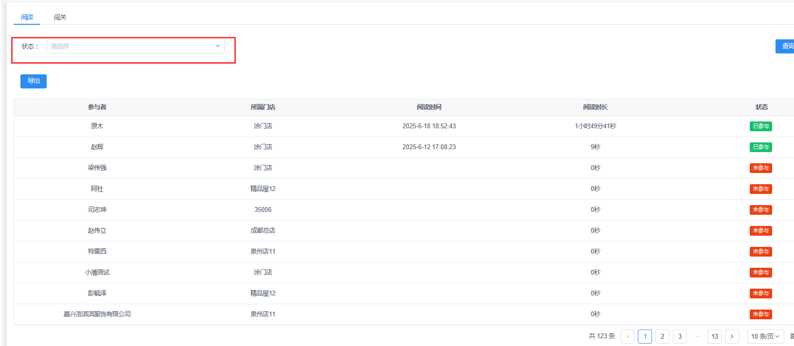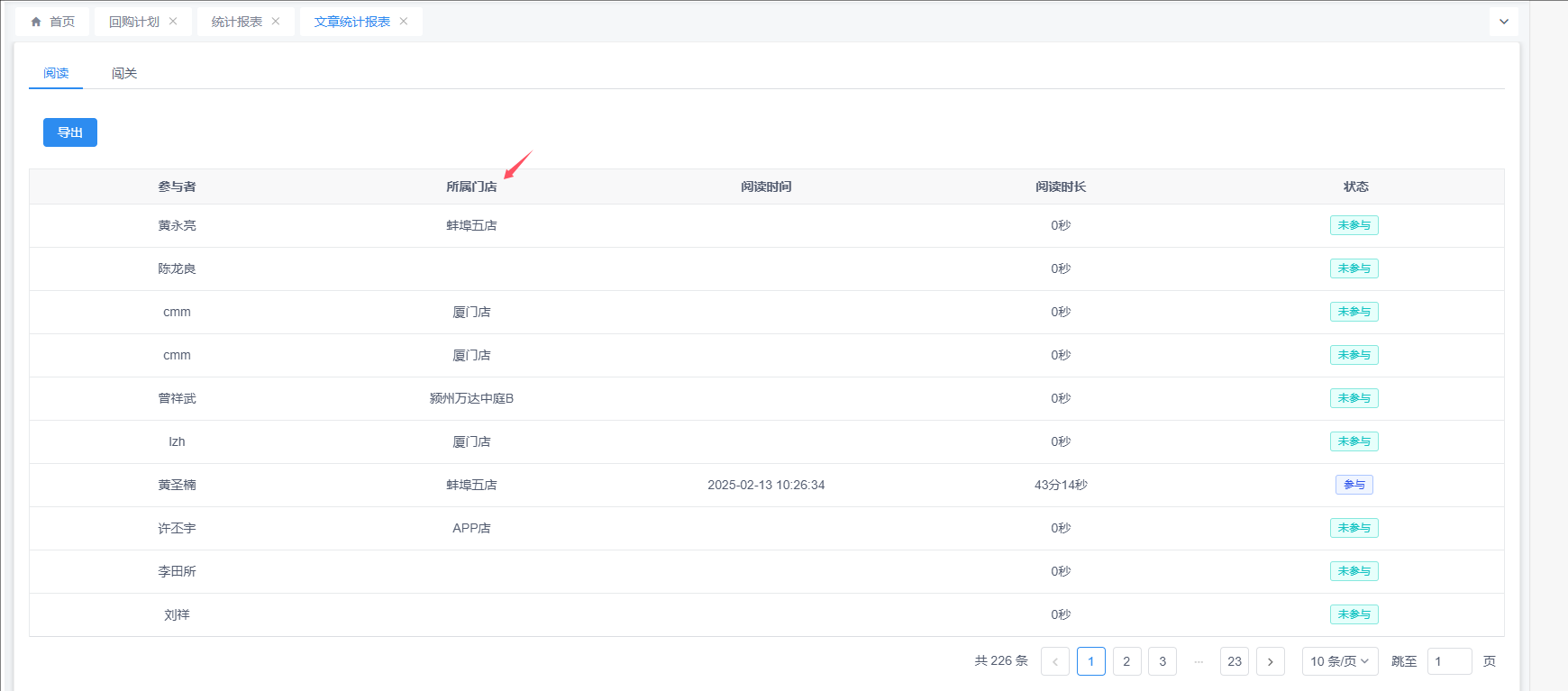 (2)店铺报表明细从阅读、闯关以及任务三个方面来展示数据,阅读模块可看到该店铺一个月内参与阅读的阅读记录,同理,闯关以及任务展示的数据,时间阶段同店铺总览嗦设置的时间条件相同。