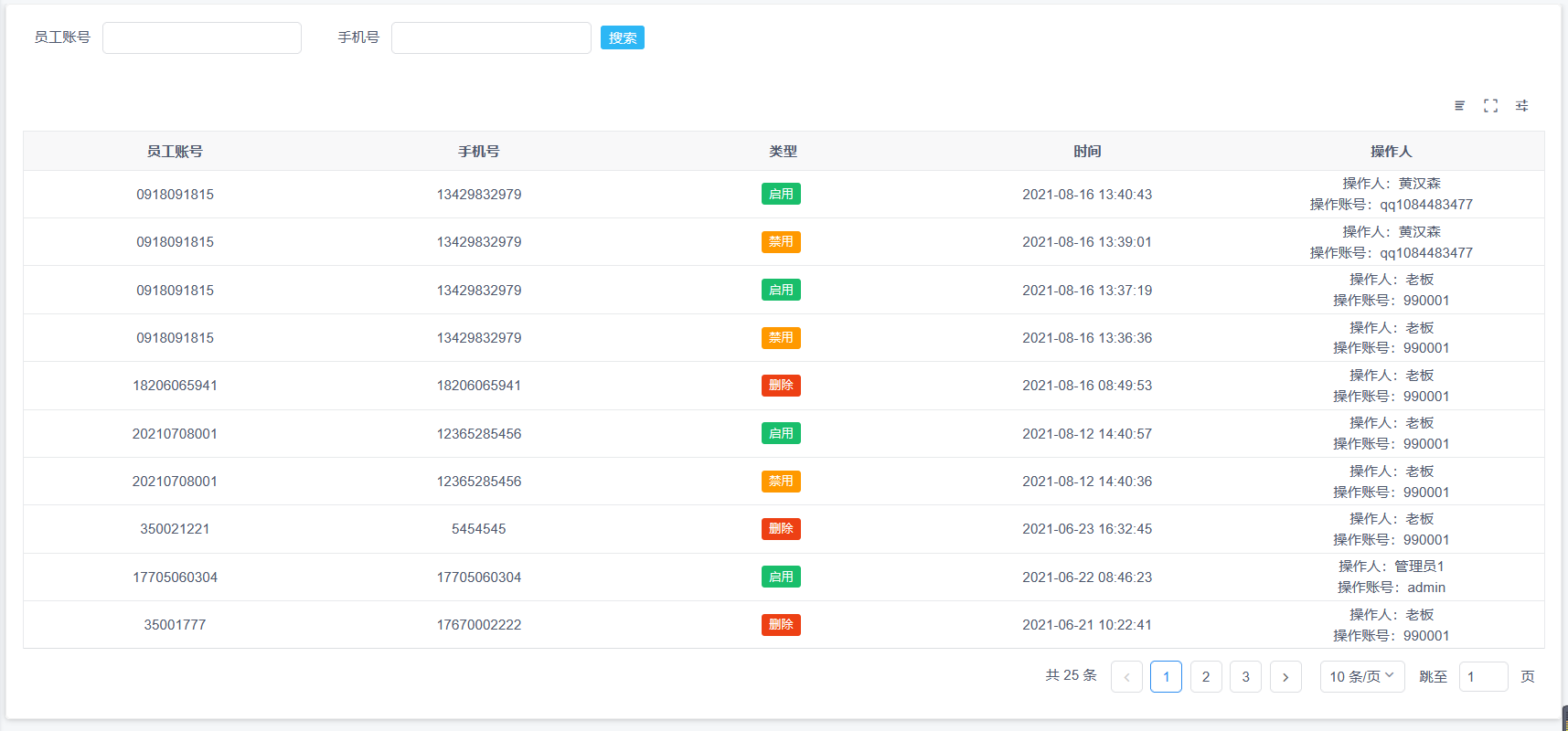 用于查看、新增、修改员工账号信息,修改账号状态以及设置账号角色等