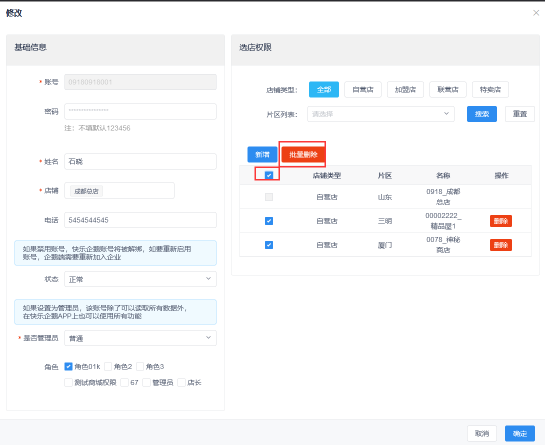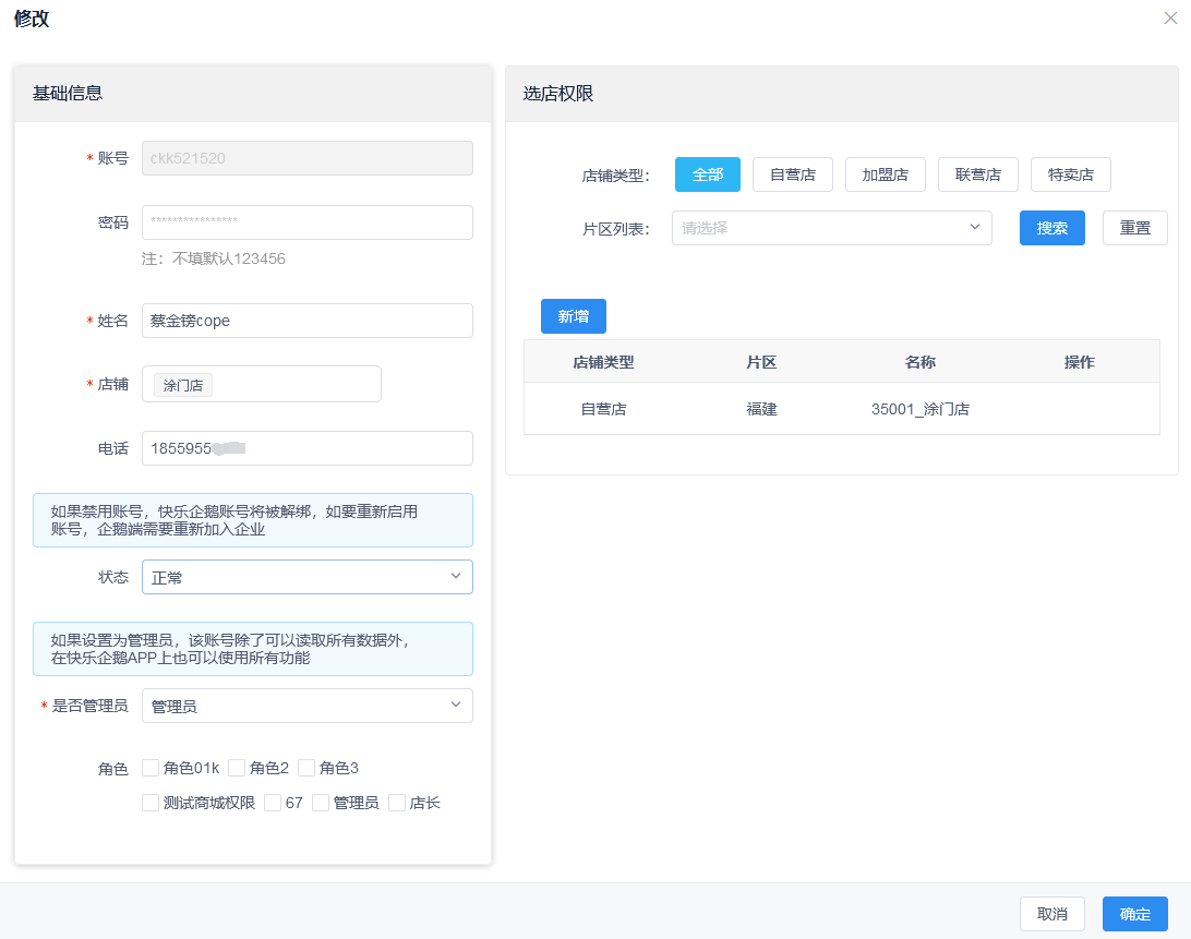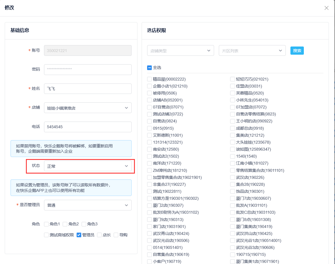 员工账号支持修改员工的所属店铺、选店权限等基础信息。修改账号状态为禁用则可禁用账号。此时应注意:如果禁用账号,快乐企鹅账号将被解绑,如要重新启用账号,企鹅端需要重新加入企业
