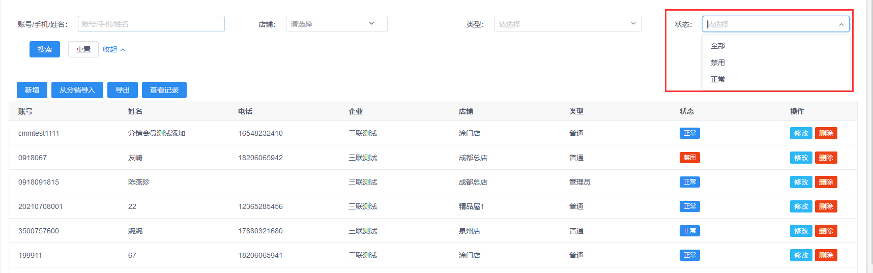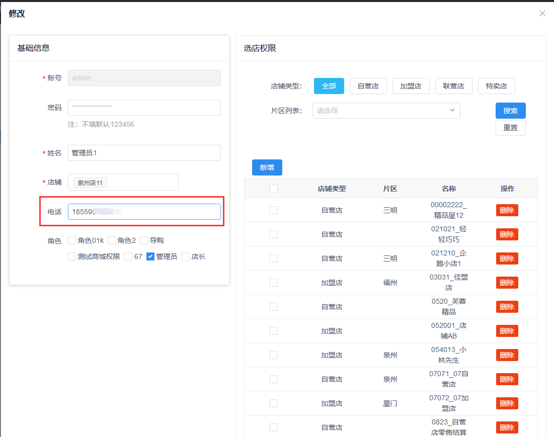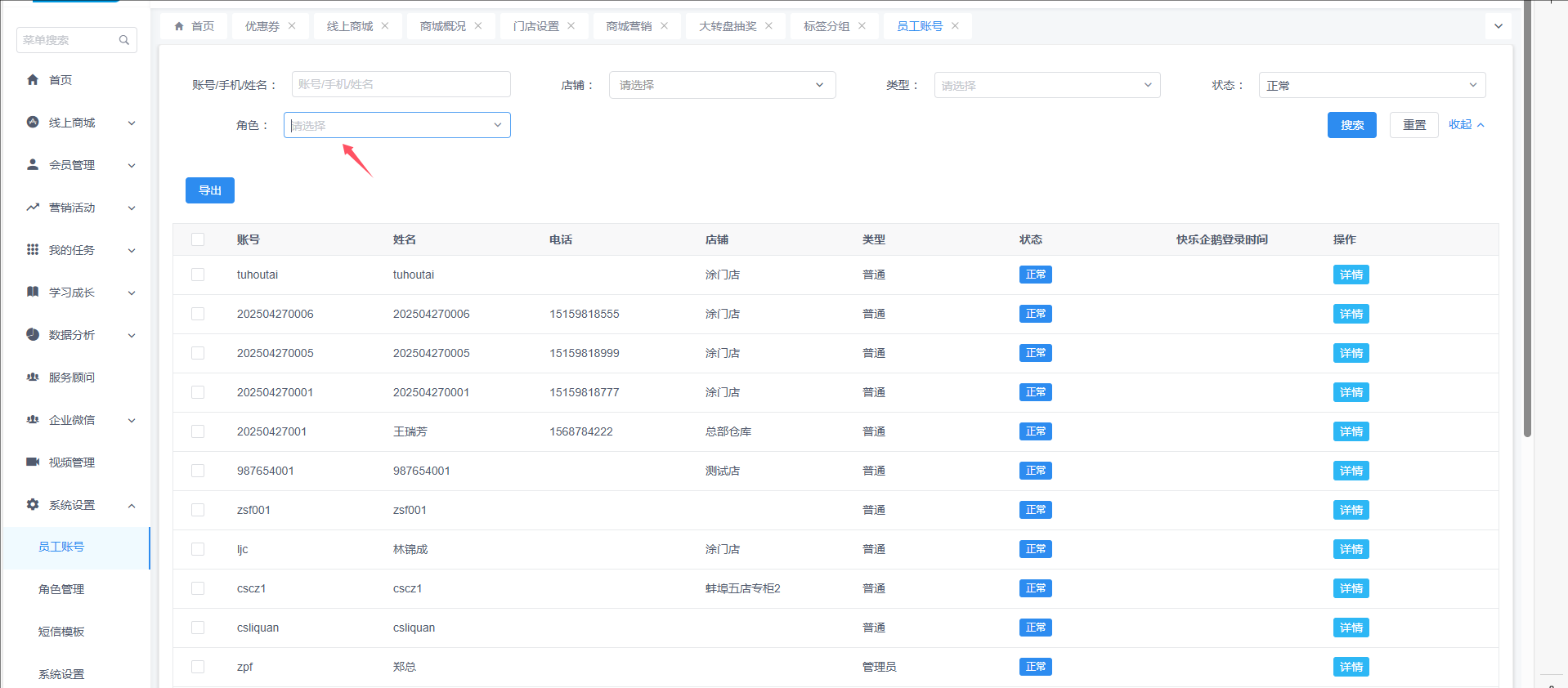 9.创客员工管理选店权限单击店铺类型自动搜索